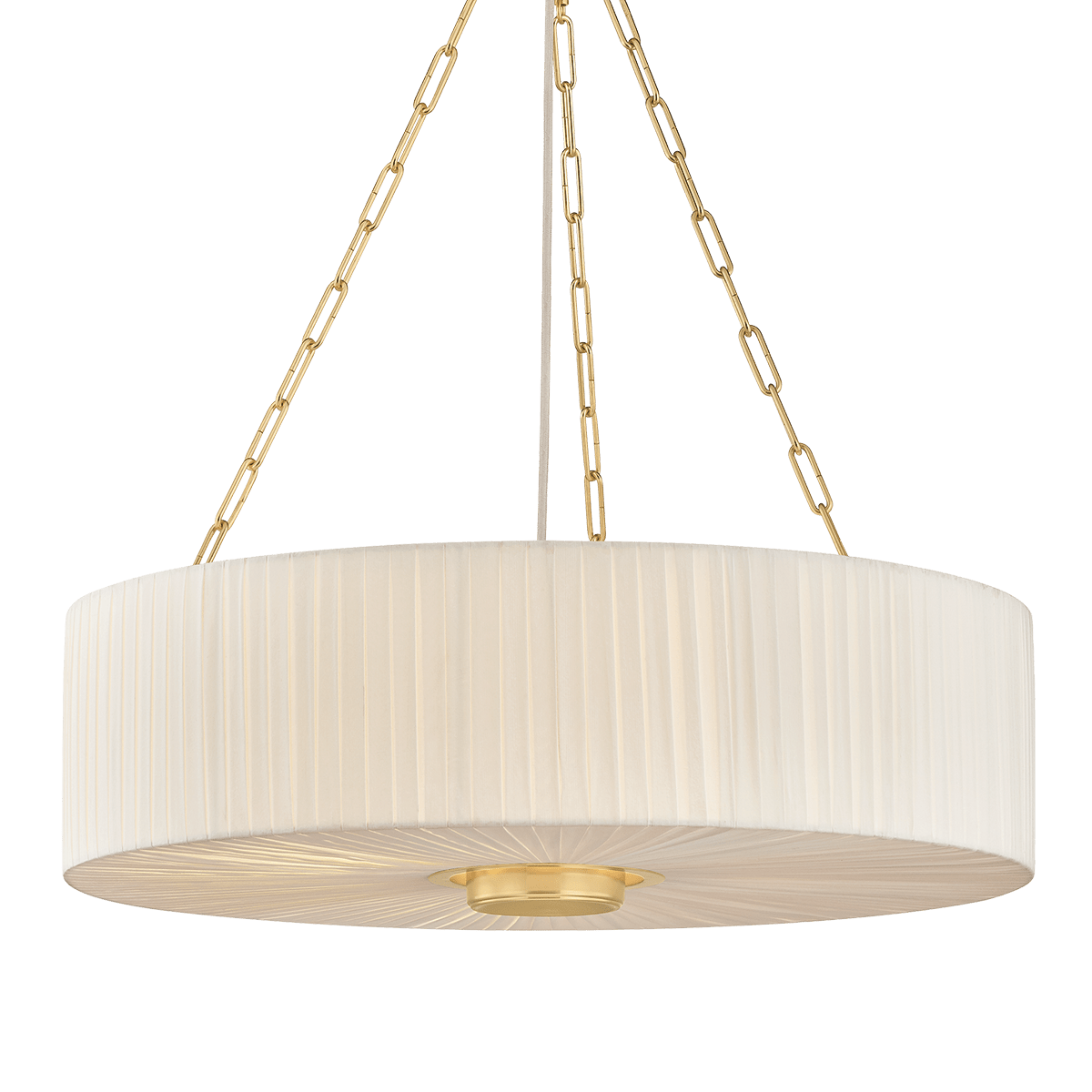 Camby balances oversized proportions with tailored details to create a sophisticated statement pendant. Supported by a triple-chain system, the pleated ivory linen shade channels a classic sense of style. An Aged Brass oculus anchors the piece, adding a focal point from below. Available in 3 and 4-light options, Camby pairs beautifully with many design schemes.