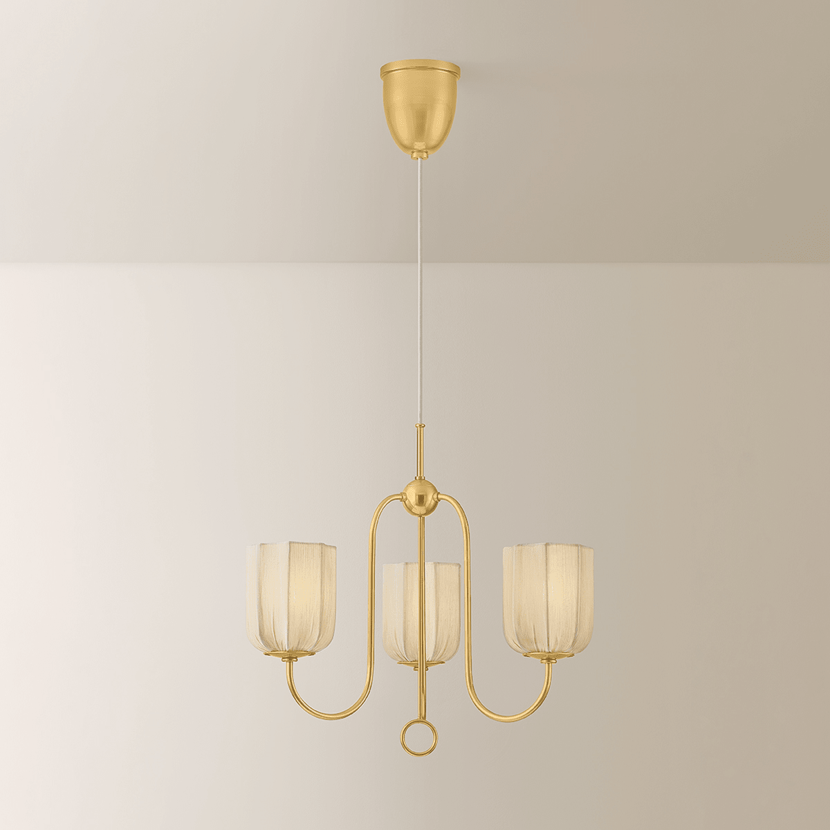 A love affair with vintage decadence, the Samantha family features an expressive rise-and-fall chandelier and a botanically-inspired sconce. The swooping metalwork and central finial of the 3-light chandelier recall the sculptural curves of Art Nouveau. Soft cotton shades gather at the bottom and relax at the top, creating a natural, fluted silhouette. An Aged Brass frame shimmers as you walk by.