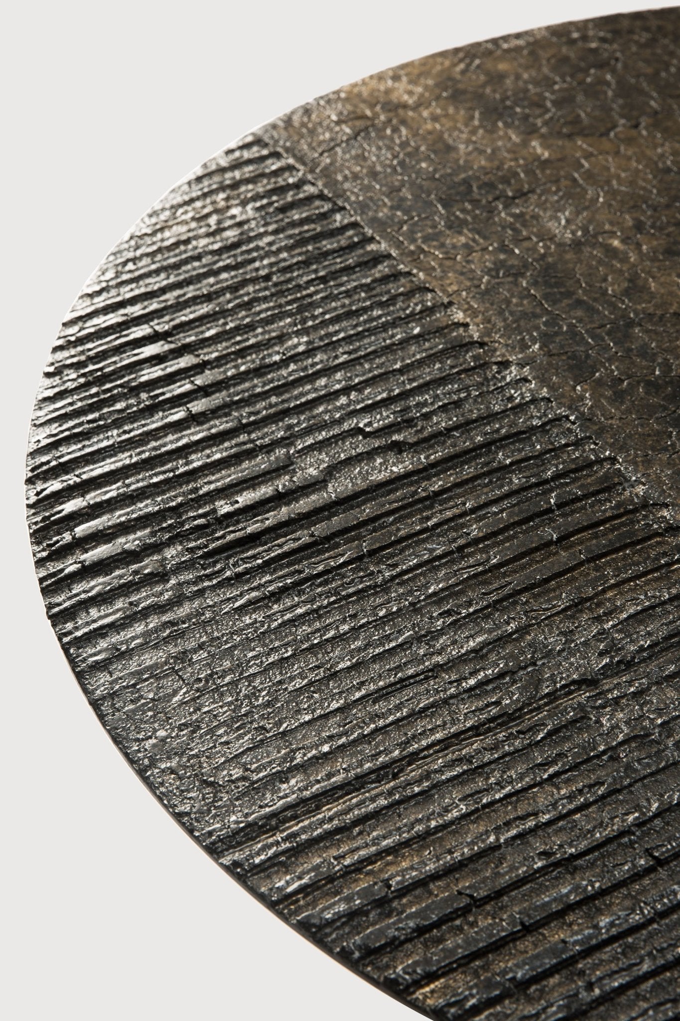 The Luna coffee table by Ethnicraft is a striking fusion of natural materials and contemporary design. Crafted with a varnished Minerals finish, the table's surface evokes the subtle textures and hues found in volcanic stone, lending an organic depth that invites closer inspection. Its round silhouette softens any space, while the carefully linear Lava Whisky wood base provides a grounded contrast with warm, amber undertones that complement the dark, mineralized top.