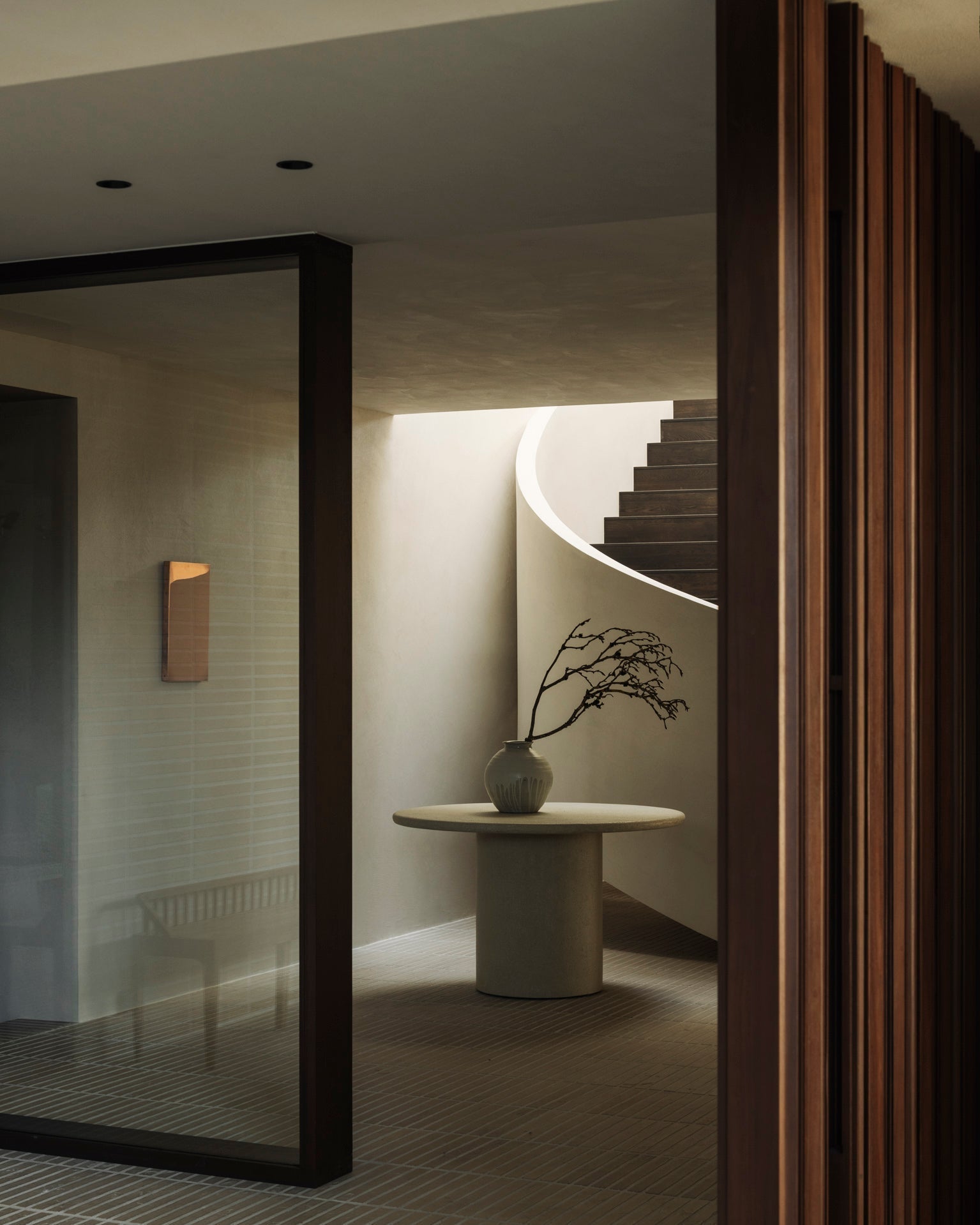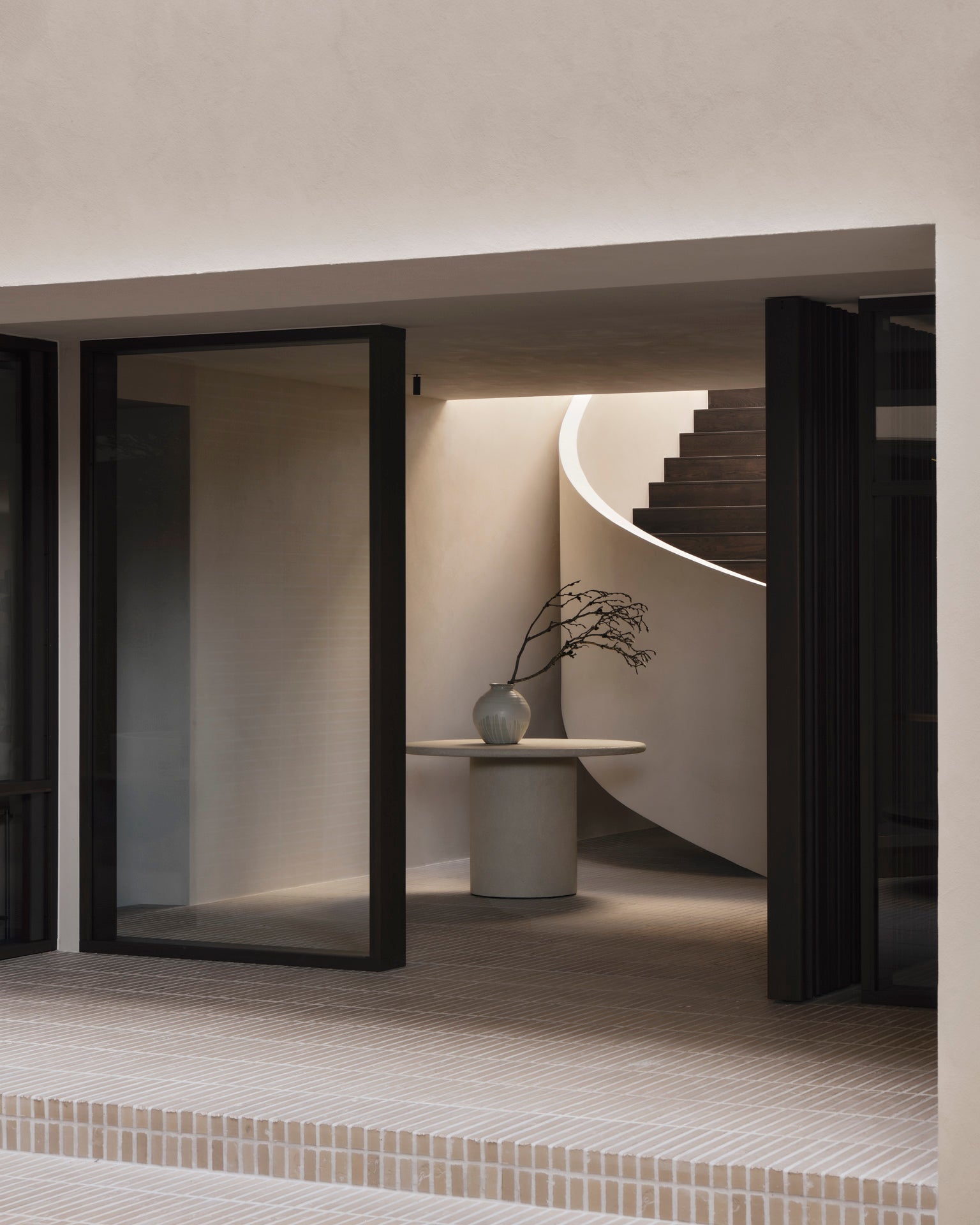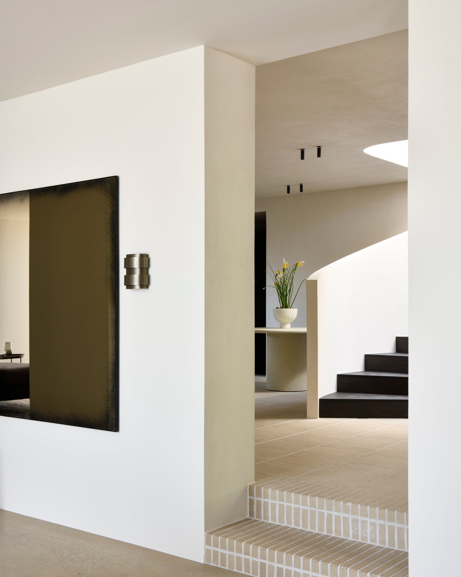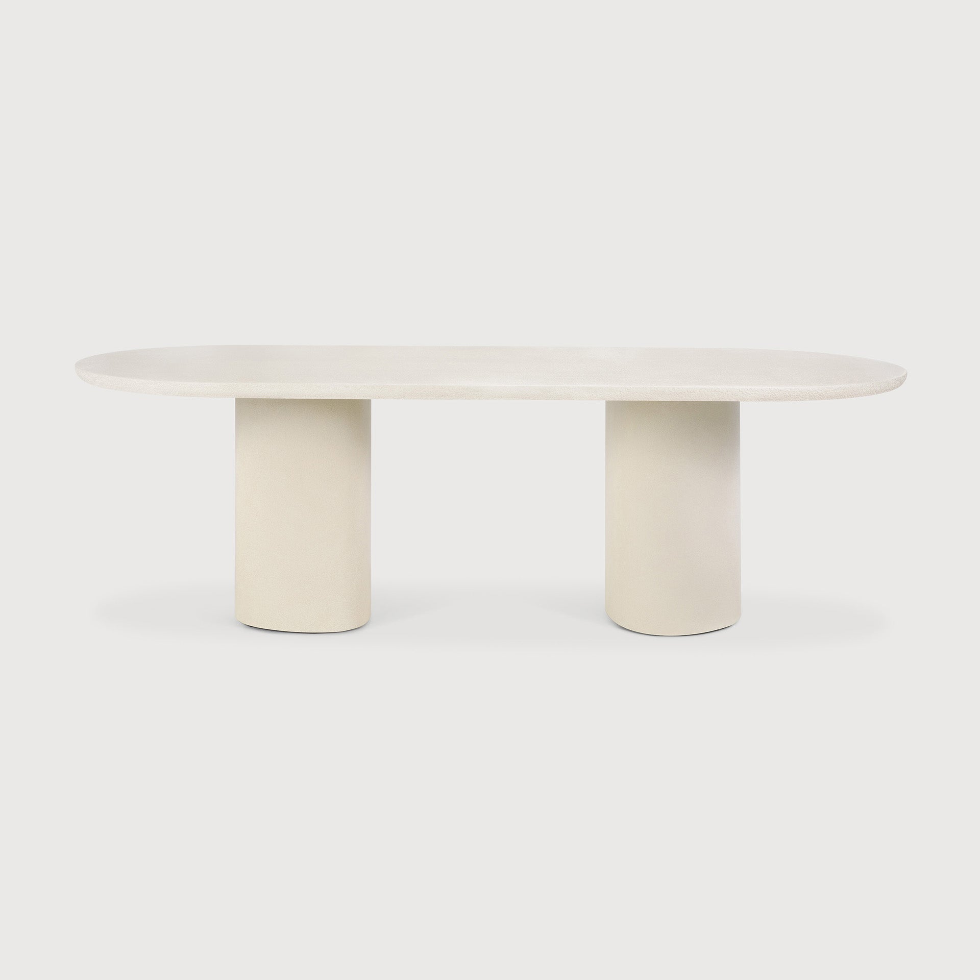 The Elements dining table features a varnished microcement top in Off White with organic, sculpted forms. Each shape offers a unique dining experience. Available in round (3 sizes), pebble, and oblong shapes.