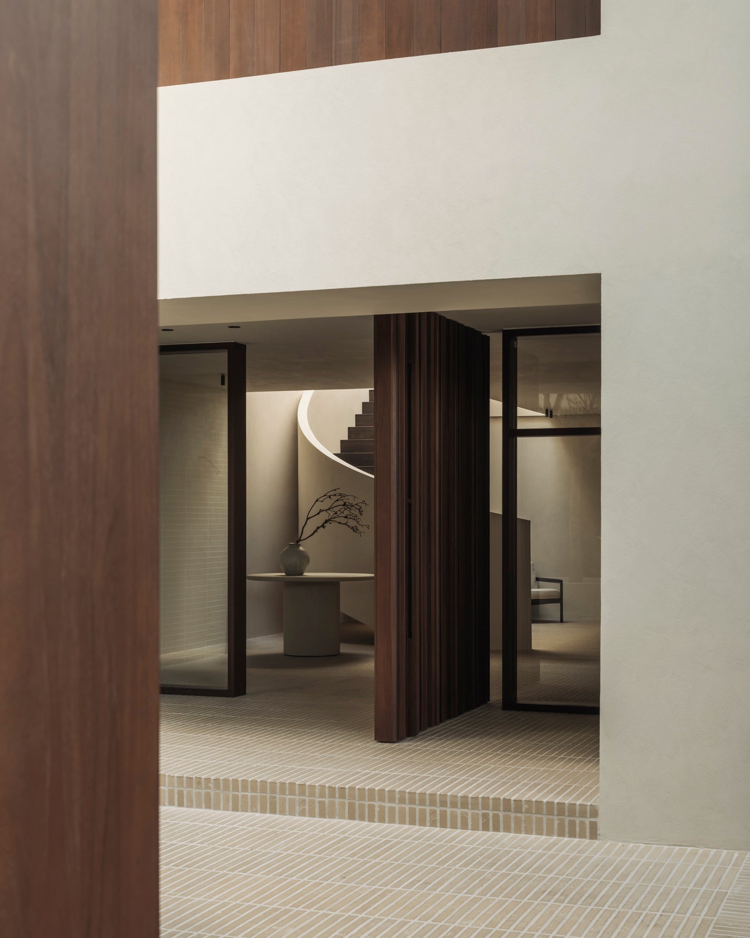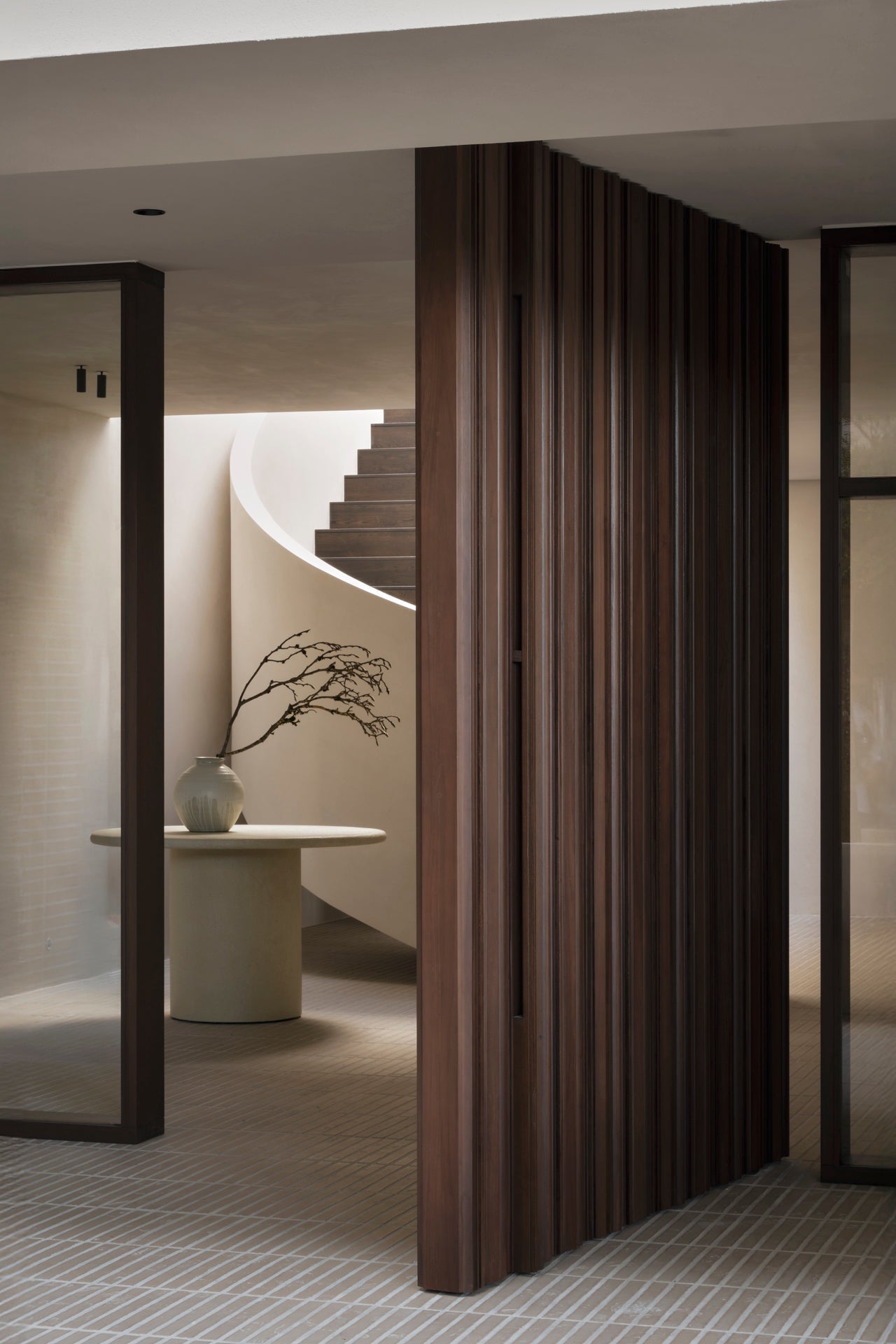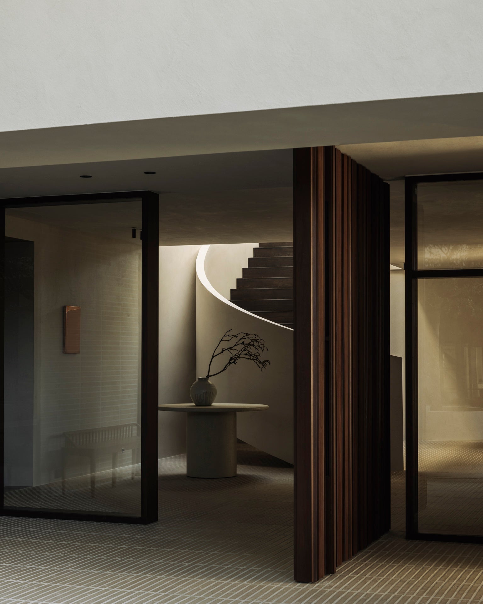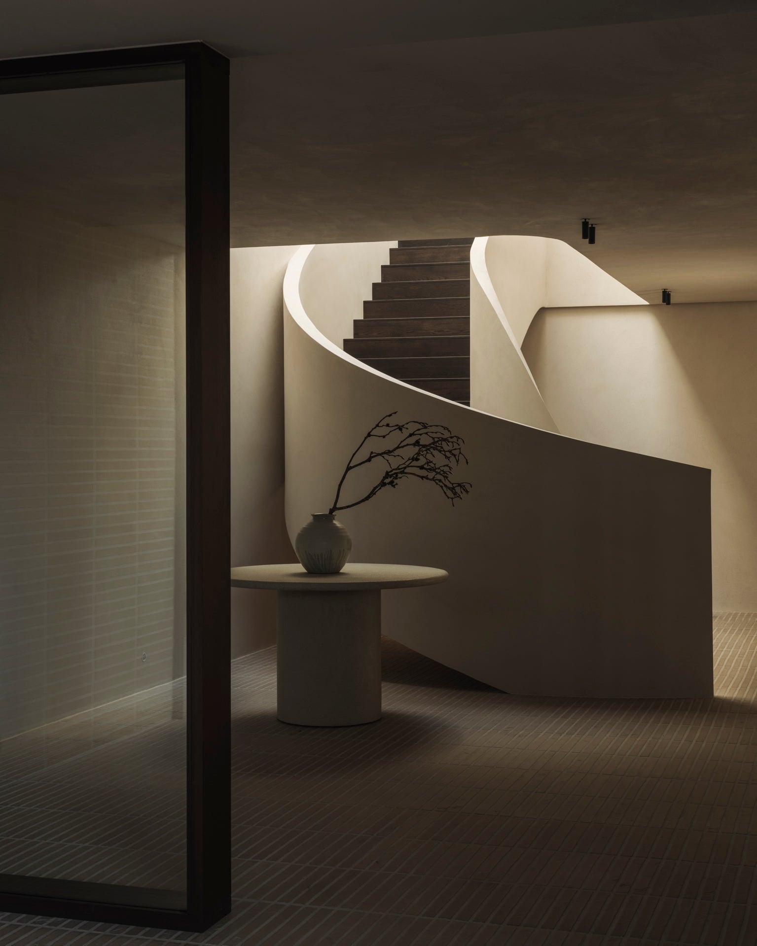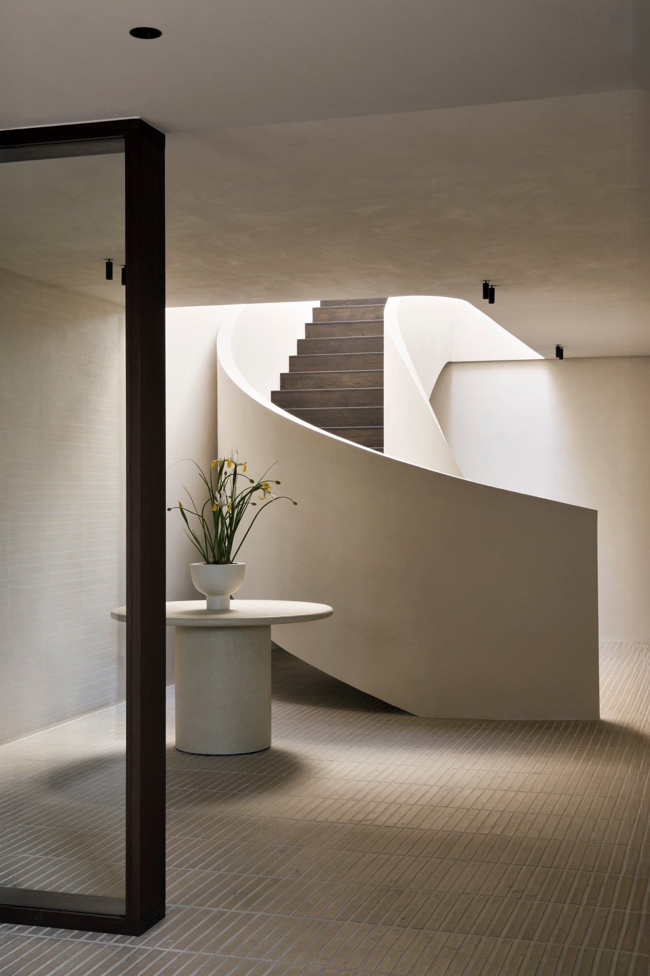 The Elements dining table features a varnished microcement top in Off White with organic, sculpted forms. Each shape offers a unique dining experience. Available in round (3 sizes), pebble, and oblong shapes.