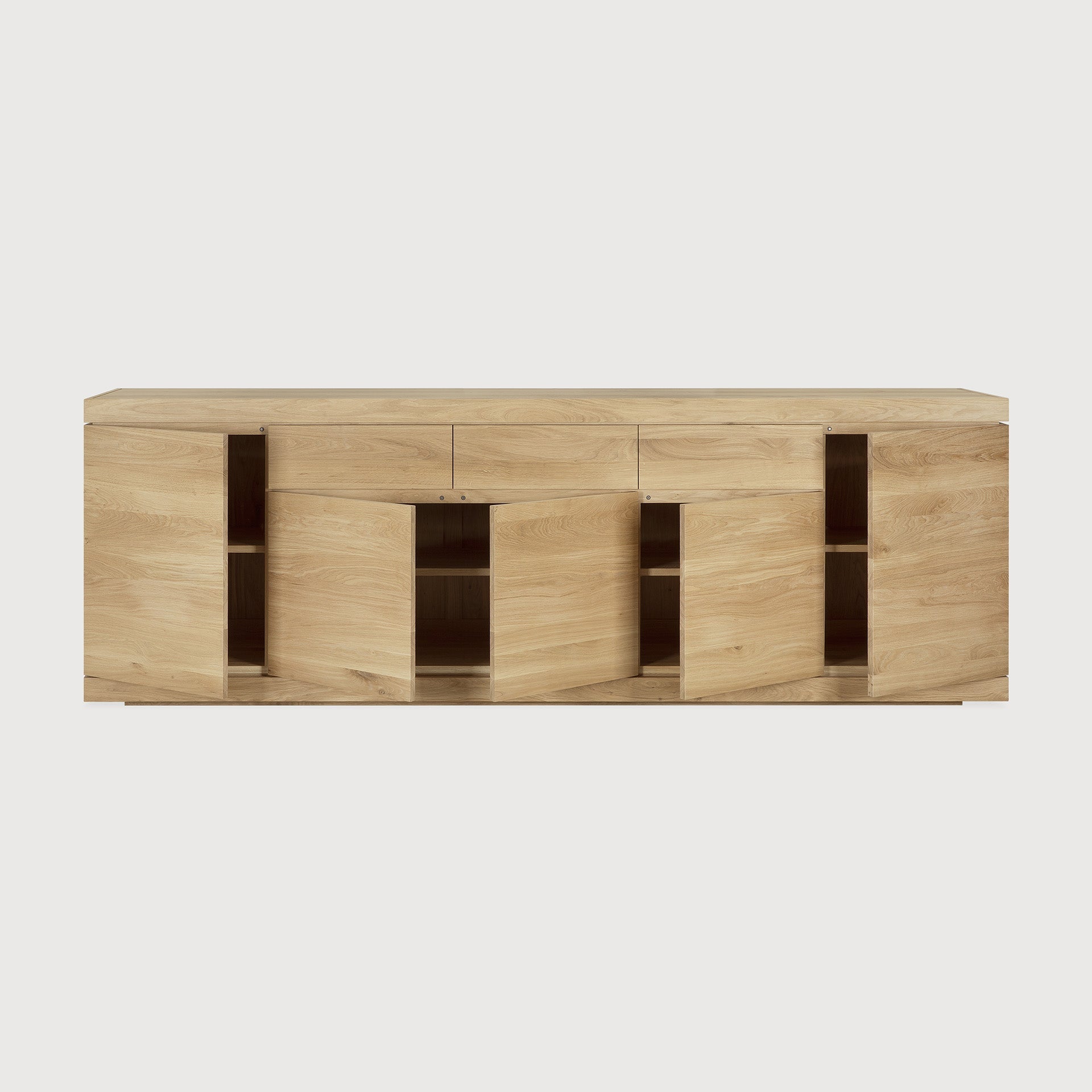In the realm of artisanal craftsmanship, the Burger sideboard by Ethnicraft emerges as a statement of masterful oak artistry. Its robust proportions—five doors and three drawers—offer a sculptural presence that anchors any interior with a grounded warmth, while the natural grain fans out like a quiet symphony of texture. The sideboard’s clean, angular silhouette is punctuated by subtle joinery details that celebrate the wood’s innate character rather than conceal it.