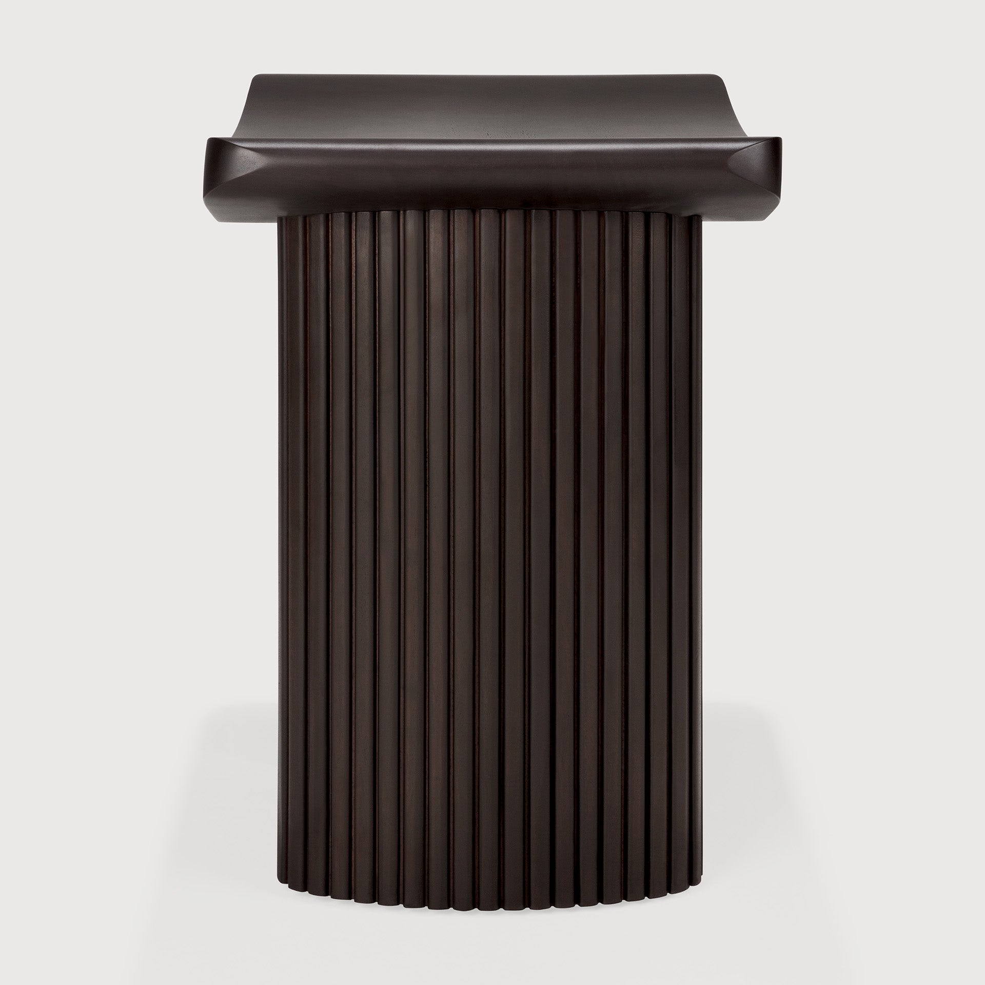 The Roller Max stool by Ethnicraft showcases the natural beauty of varnished mahogany, its deep, dark brown hue enriching any space with a rich warmth. Each curve and contour highlights the wood’s organic grain, meticulously enhanced by a hand-applied finish that offers both durability and a subtle sheen. Its smooth, rounded seat invites comfort while maintaining a sculptural elegance that is unmistakably artisanal.