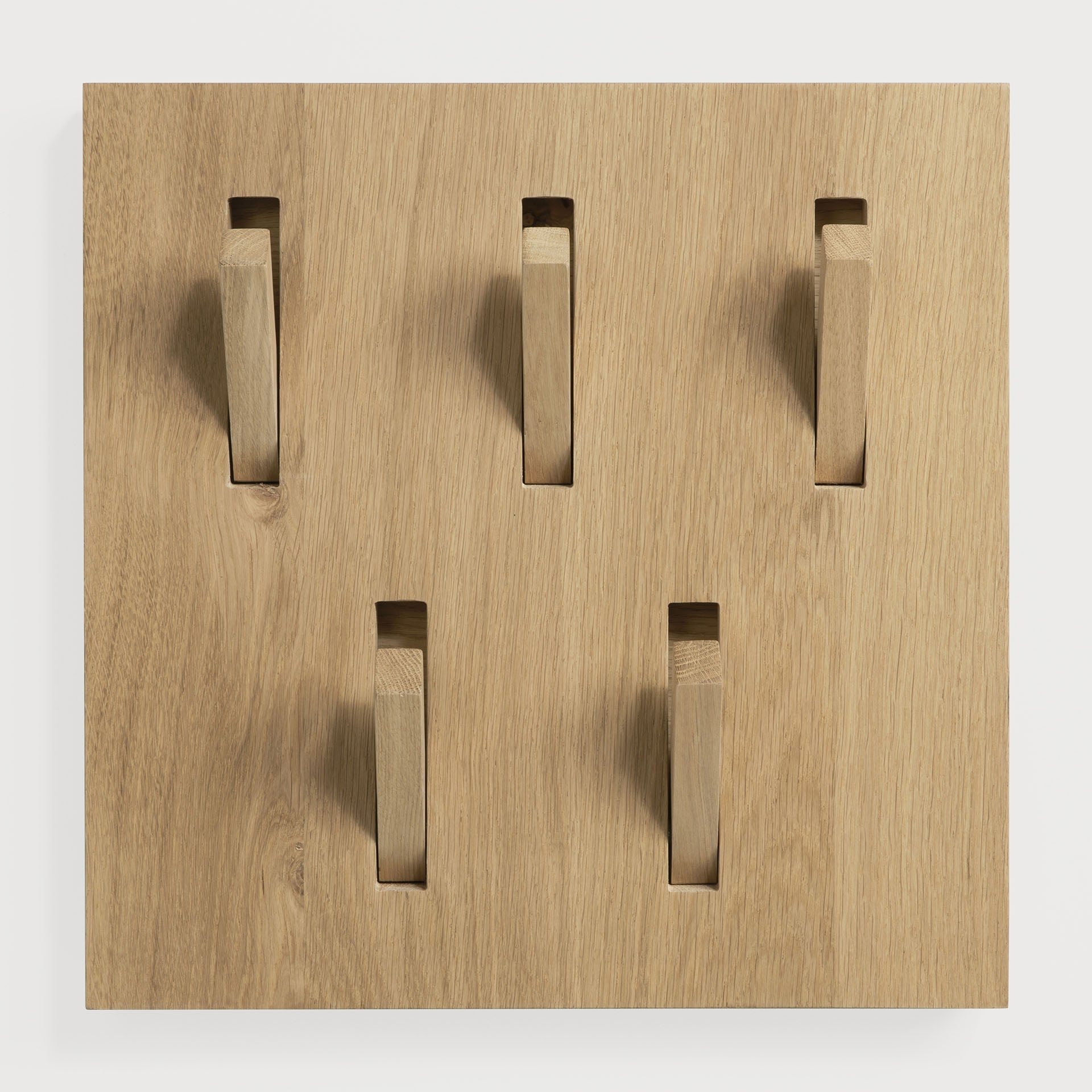 Crafted with a devotion to natural beauty and subtle functionality, the Utilitile wall hanger by Ethnicraft reimagines everyday utility through the lens of refined design. Constructed from varnished oak, its surface reveals a warm patina that deepens with time, evoking the quiet elegance of Scandinavian woodwork. The five sculptural hangers extend gently from a solid backplate, each one a slender yet sturdy silhouette that blends utility and artistry in seamless harmony.