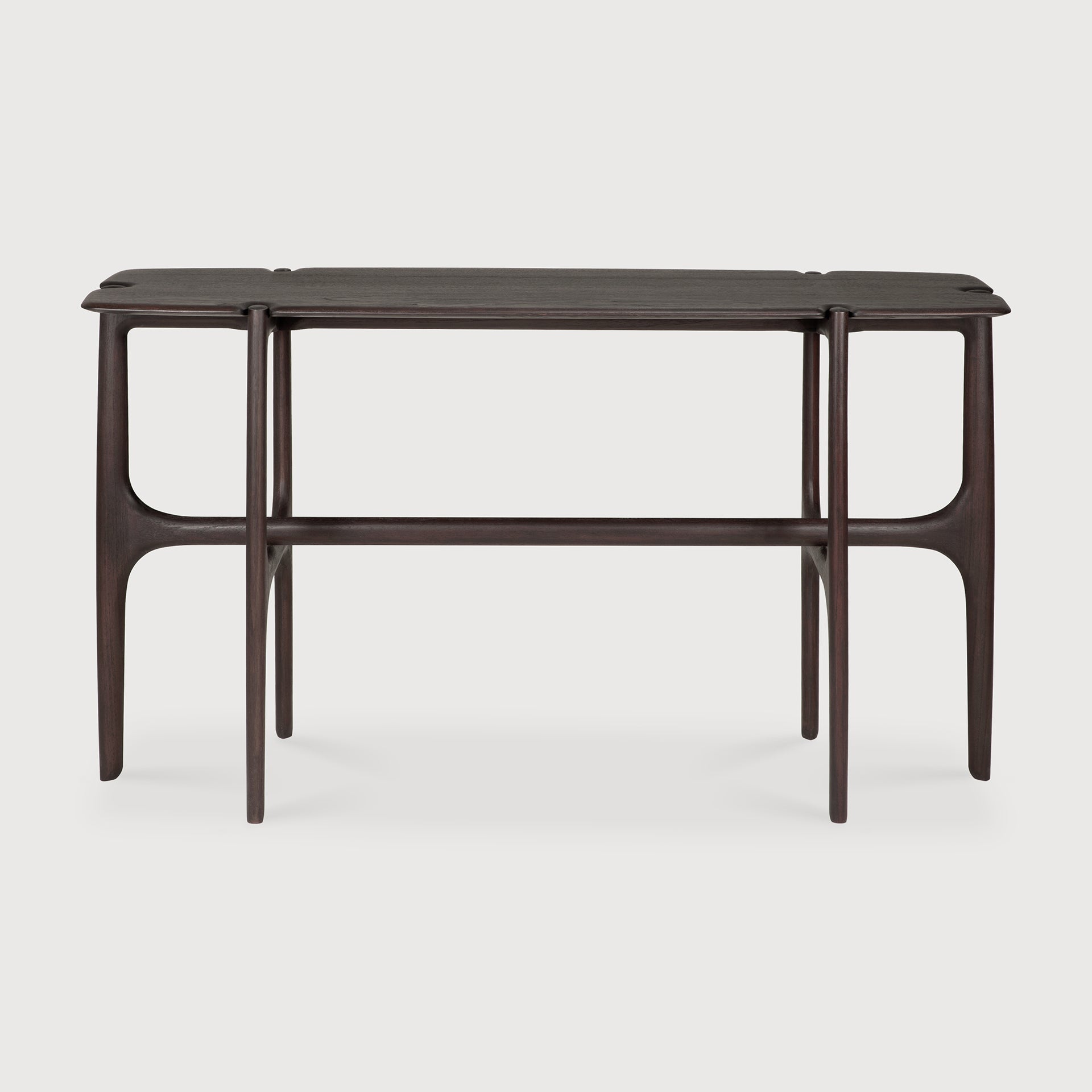 Crafted from dark brown varnished teak, the PI console by Ethnicraft embodies a striking balance between bold presence and understated elegance. Its six slender legs impart a sense of architectural lightness while supporting a solid rectangular top that commands attention without overwhelming a space. The subtle grain of the teak, enhanced by a warm varnish, imbues the piece with a tactile richness that invites closer inspection, making it as much a sculptural element as a functional surface.