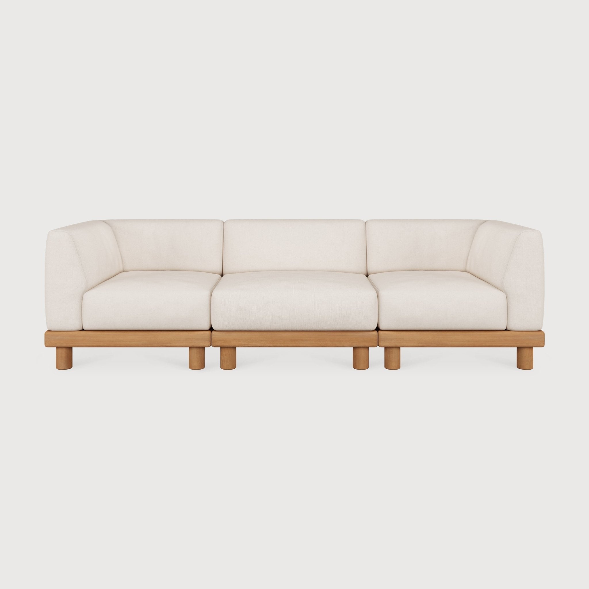 Crafted with meticulous attention to detail, the Monocle outdoor modular sofa by Ethnicraft redefines comfort through its seamless blend of natural teak and pristine white fabric. The teak frame, renowned for its durability and rich, warm tones, gracefully withstands the elements while developing a distinguished patina over time. This one-seater module offers both resilience and an organic aesthetic that complements contemporary outdoor settings.