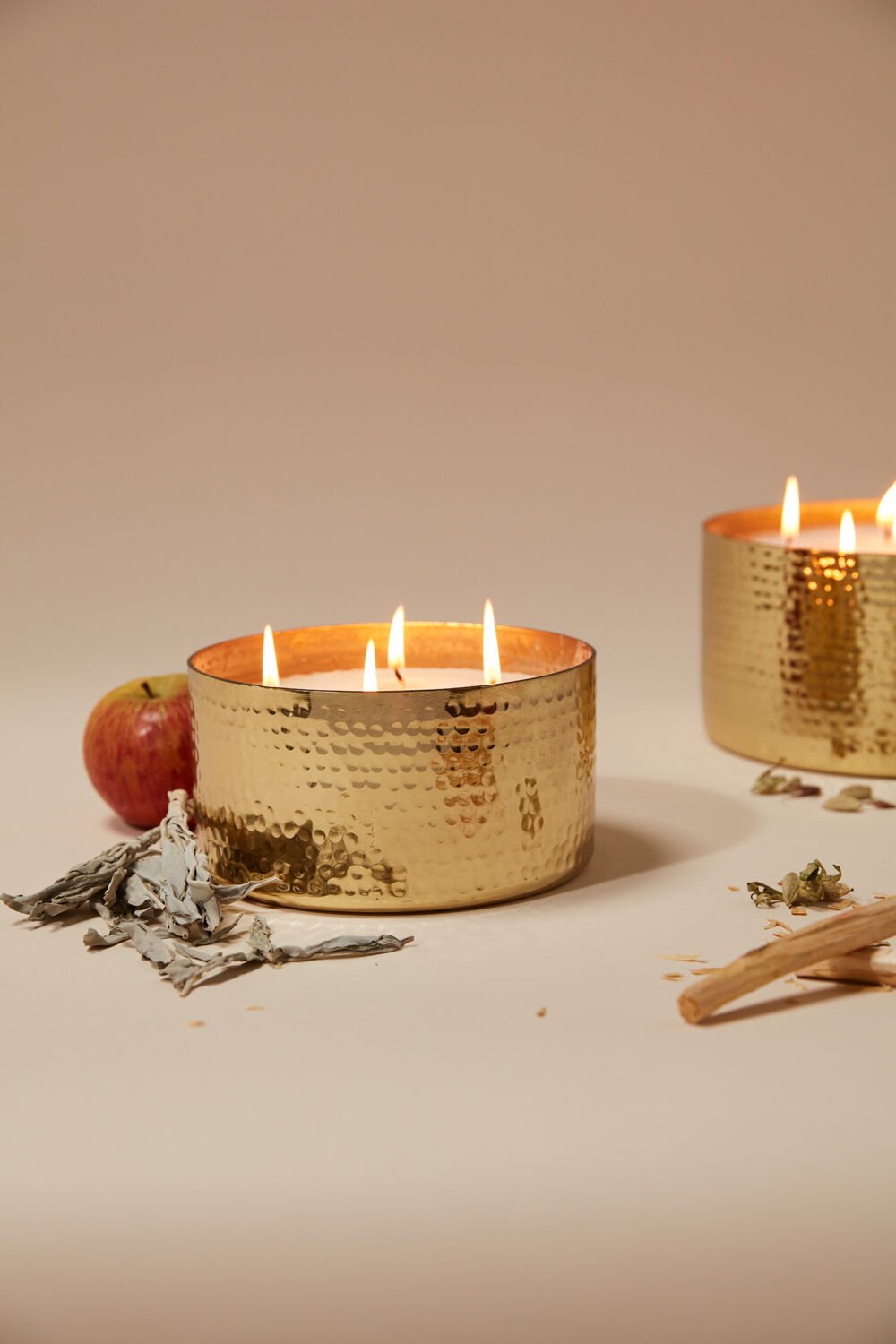 A modern gold hammered metal vessel becomes the beautiful Rituale Candle in the scent "Awaken" The new Rituale Candle collection is an upscale way to add modern ambiance to your home or event. Fragrance Notes: Apple, Jasmine, Sage, Sandalwood.