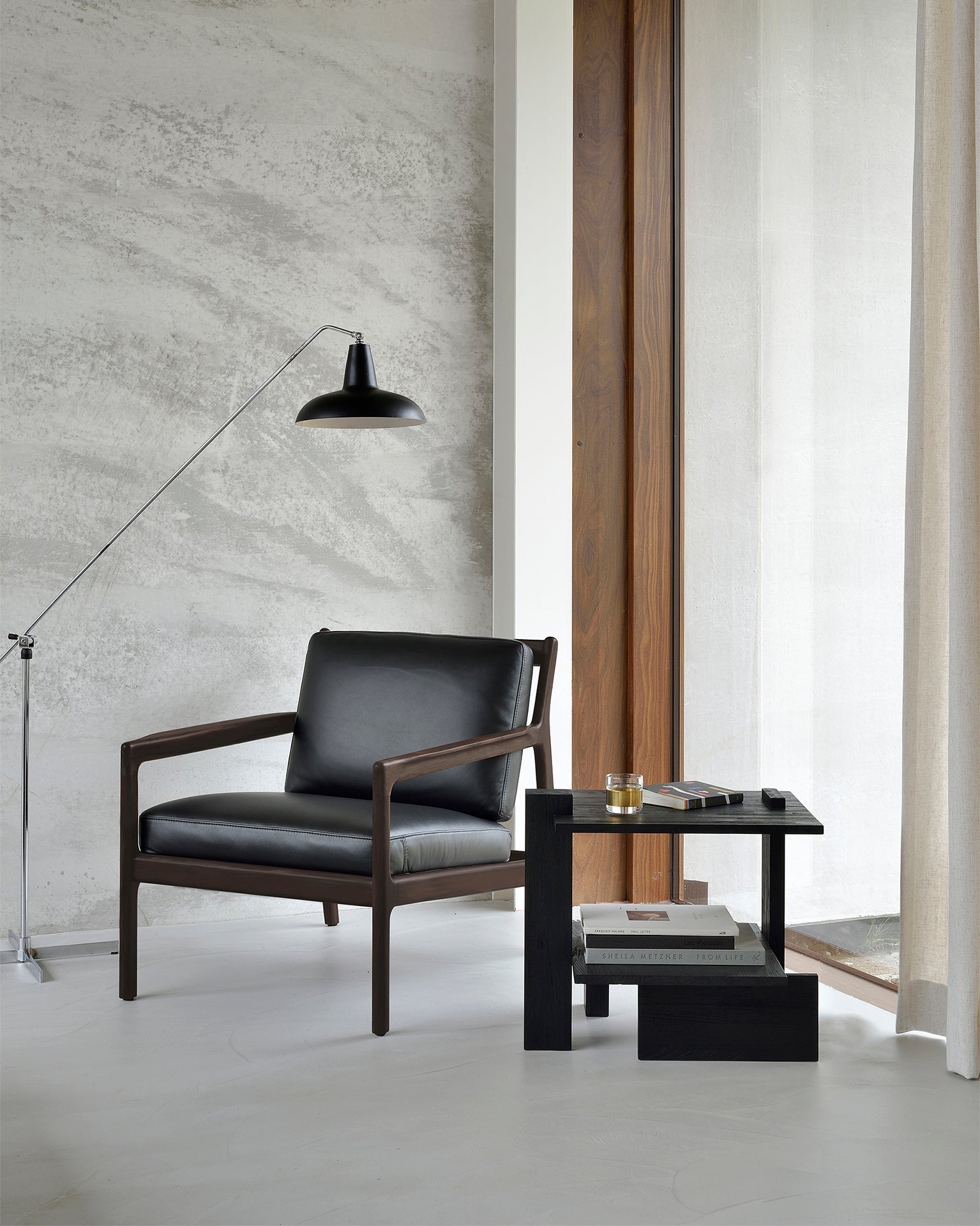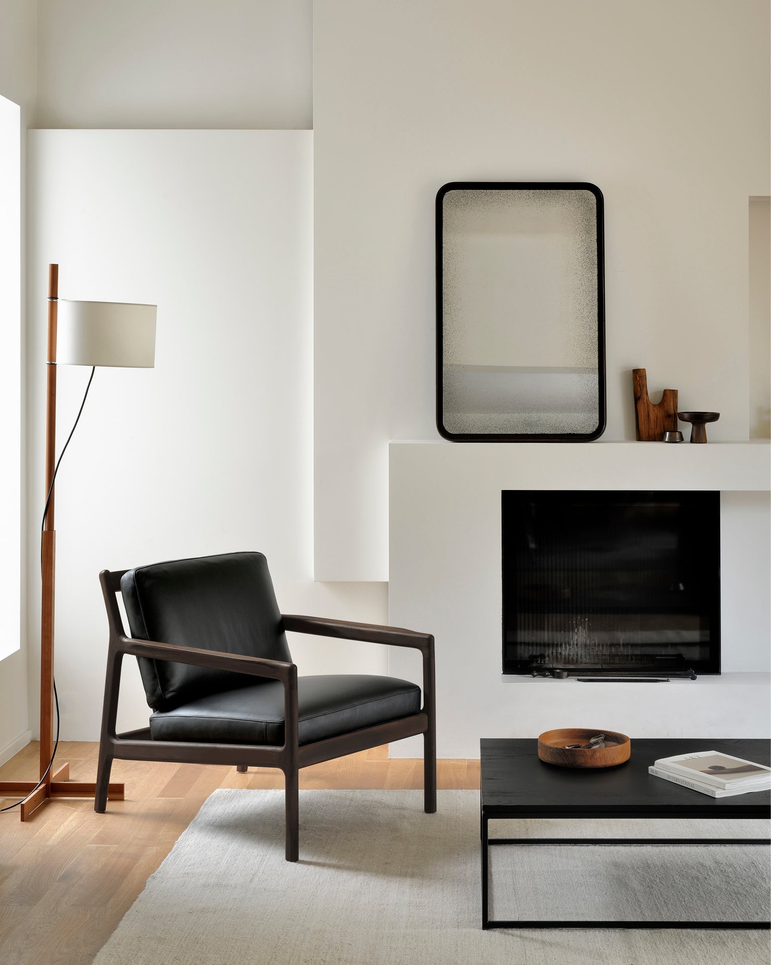 Crafted from solid mahogany and finished with a meticulous varnish, the Jack lounge chair by Ethnicraft exemplifies artisanal woodwork at its finest. The varnished surface reveals the rich, dark brown grain, lending a warm depth that invites touch and admiration. The chair’s frame showcases expertly rounded edges and smooth contours, achieved through detailed hand-sanding and precise joinery. The supple Carbone leather upholstery wraps the seat and backrest in a supple embrace, its subtle marbled texture adding both visual interest and a tactile contrast to the wood’s polished sheen.