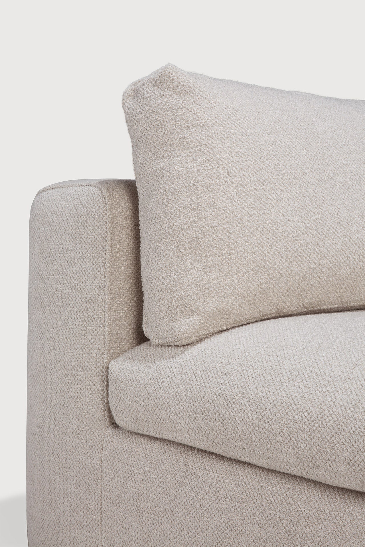 Crafted from a meticulously selected ivory fabric, the Mellow modular sofa by Ethnicraft offers a sumptuous hand-feel that complements its understated aesthetic. The textile showcases a subtle, natural weave that invites a tactile exploration, while the fabric’s soft yet durable finish ensures lasting comfort. A solid oak frame underpins the piece, its smooth, matte finish enhancing the warmth and depth of the ivory upholstery. This foundational structure is thoughtfully engineered, with precision joinery that secures the removable frame covers elegantly—allowing for easy maintenance without compromising the sofa’s sleek silhouette.