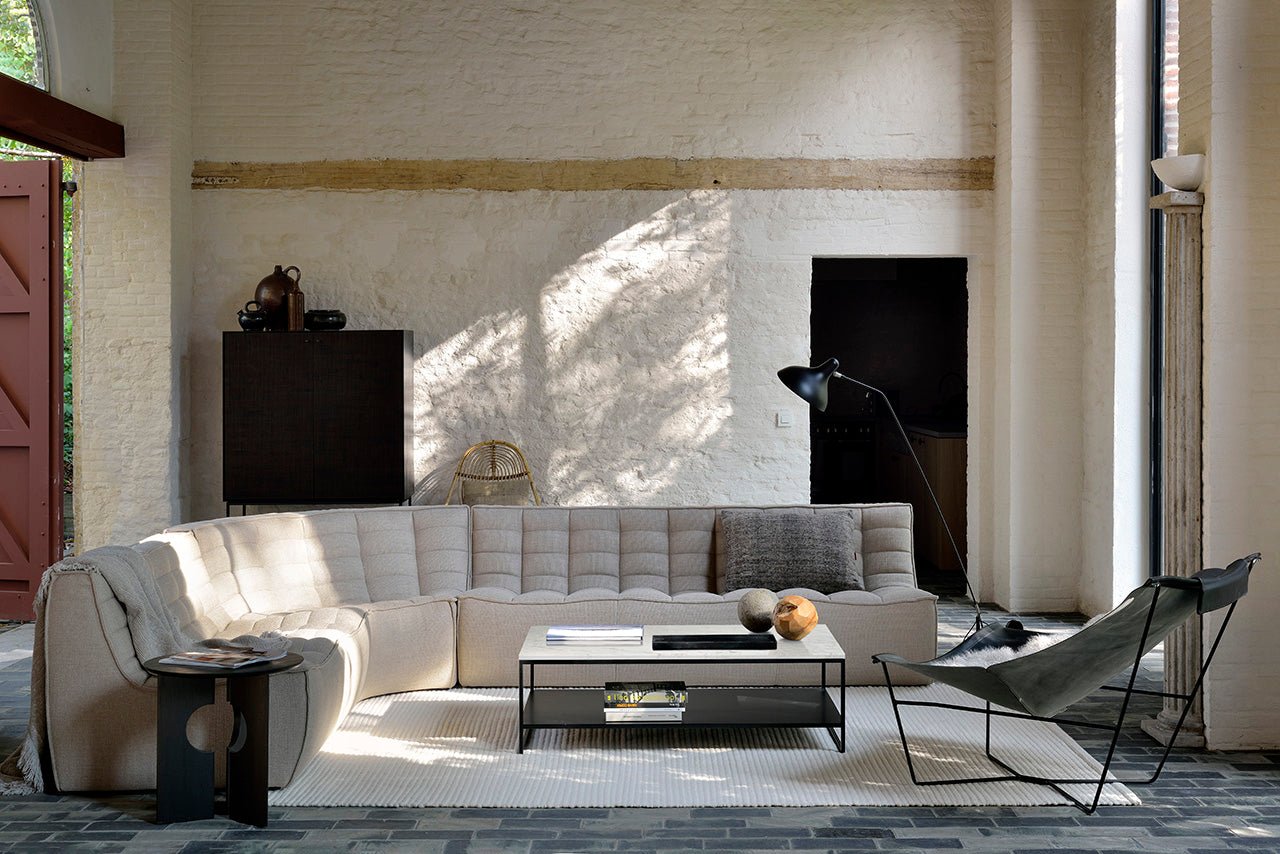 Crafted by Ethnicraft, this modular piece showcases high-quality materials that ensure lasting durability. The beige fabric is carefully chosen not only for its inviting warmth but also for its resilience against everyday wear. This sofa adapts effortlessly to various decors, appealing to homeowners who value both function and subtle elegance. Its clean lines and geometric shape lend a contemporary edge without overpowering the room.