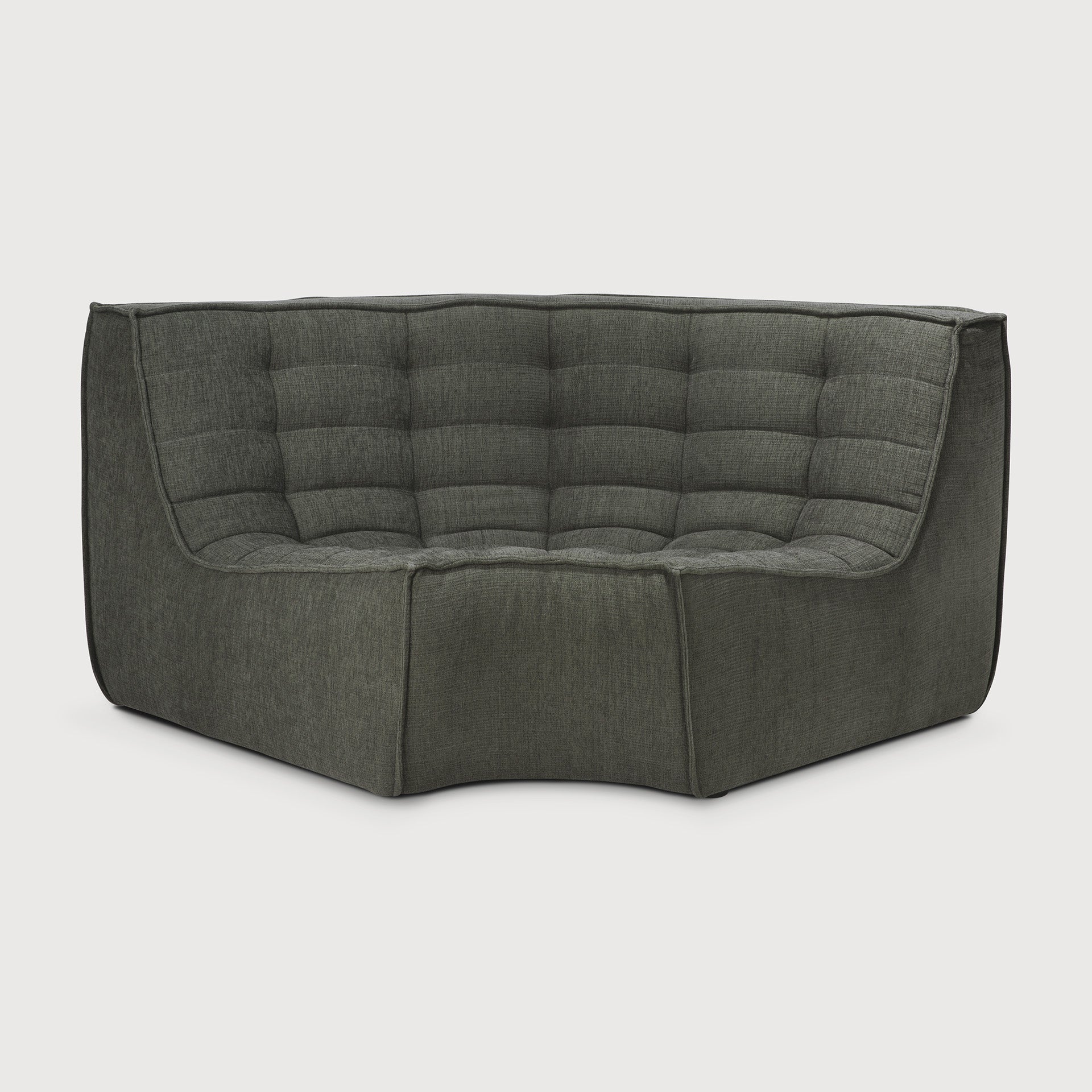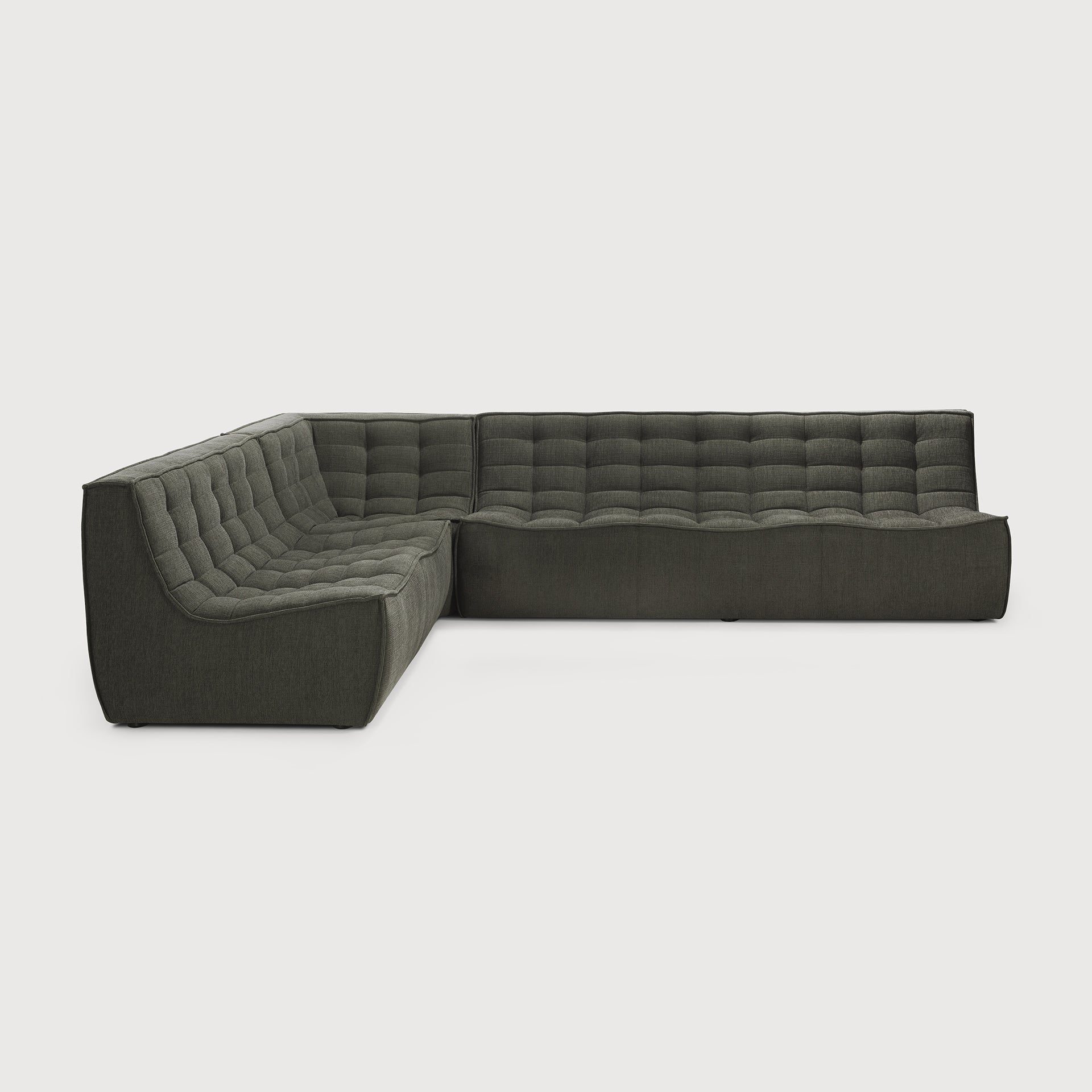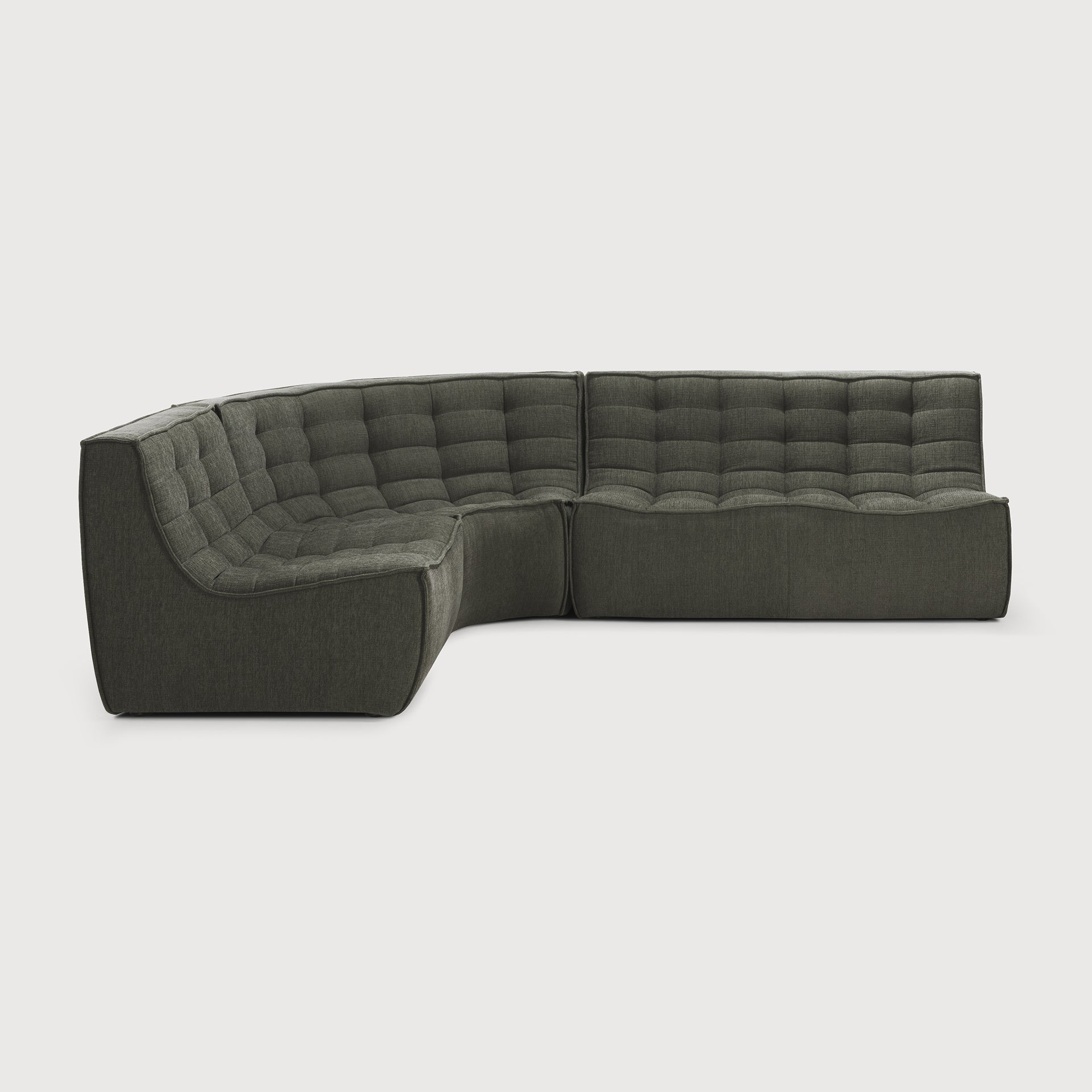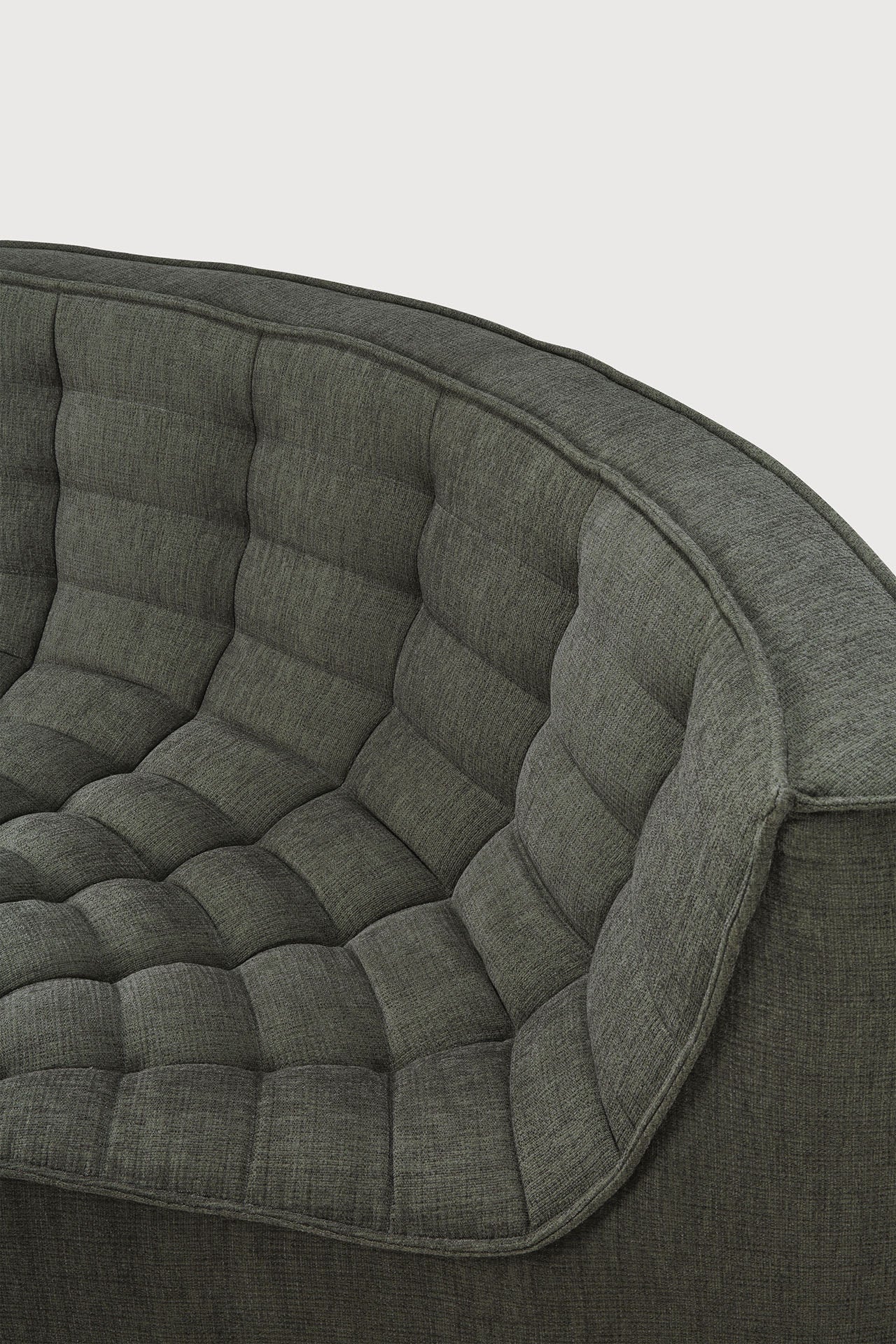 Wrapped in Moss Eco fabric, the N701 modular sofa by Ethnicraft invites a tactile experience defined by its soft yet durable weave, crafted for both comfort and longevity. The fabric’s distinct matte finish highlights the organic fibers and natural dye variations, lending an earthy, grounded character to the piece. This 90° square corner section is meticulously constructed with solid wood framing that ensures structural integrity while maintaining a light architectural presence.