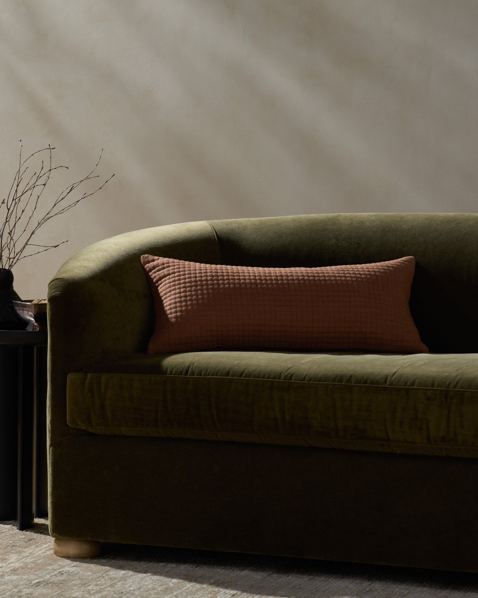 Christopher is a wonderfully soft, quilted throw pillow in rust red designed by Jeremiah Brent x Loloi. The 12” x 27” decorative pillow is made in India of polyester and cotton, an expertly crafted accent for modern home decor.