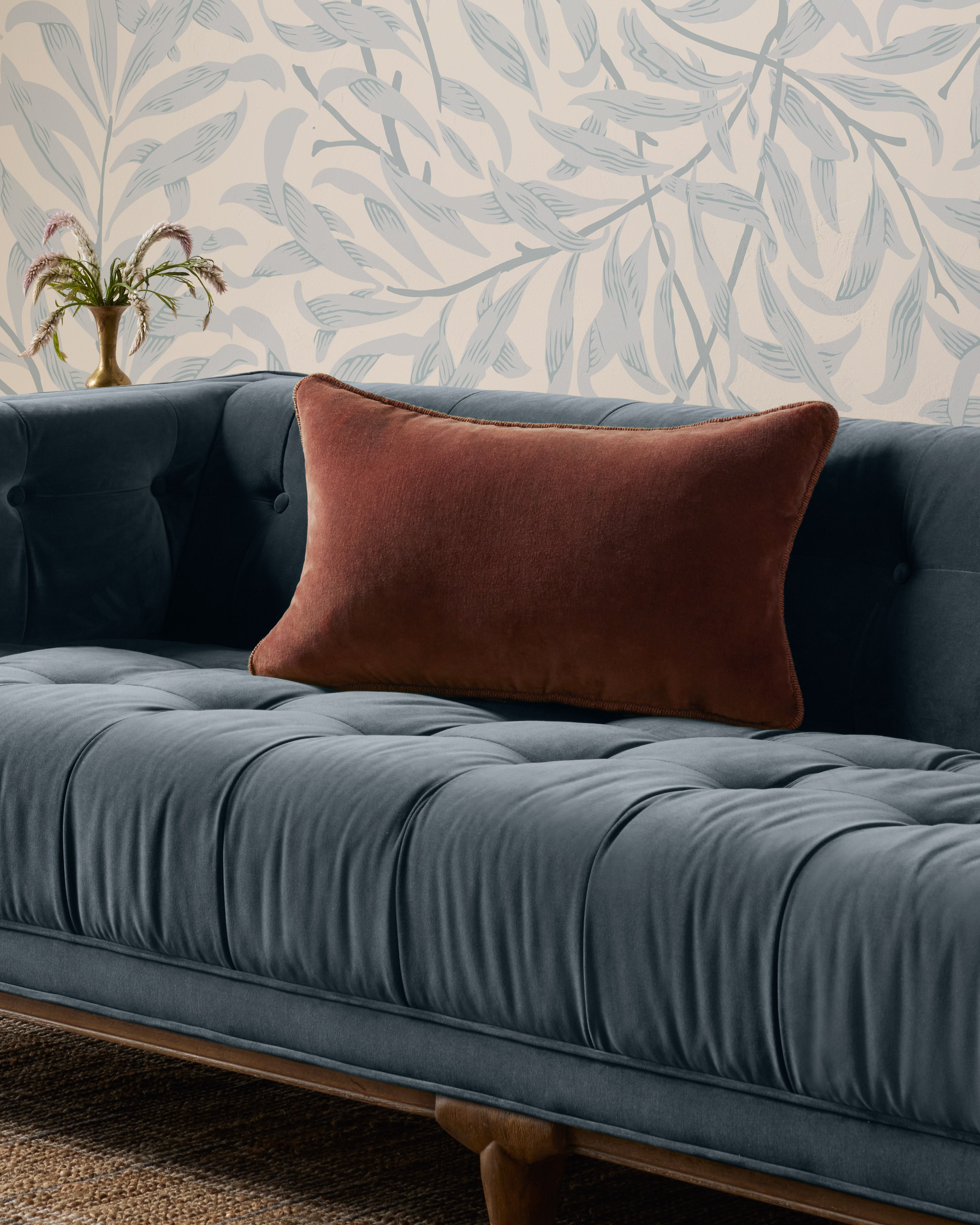 Liza is a cinnamon red velvet throw pillow from Chris Loves Julia x Loloi framed with piped edges. The pillow cover is made of 100% cotton and measures 13” x 21”, an elongated size to style in living rooms and bedrooms.