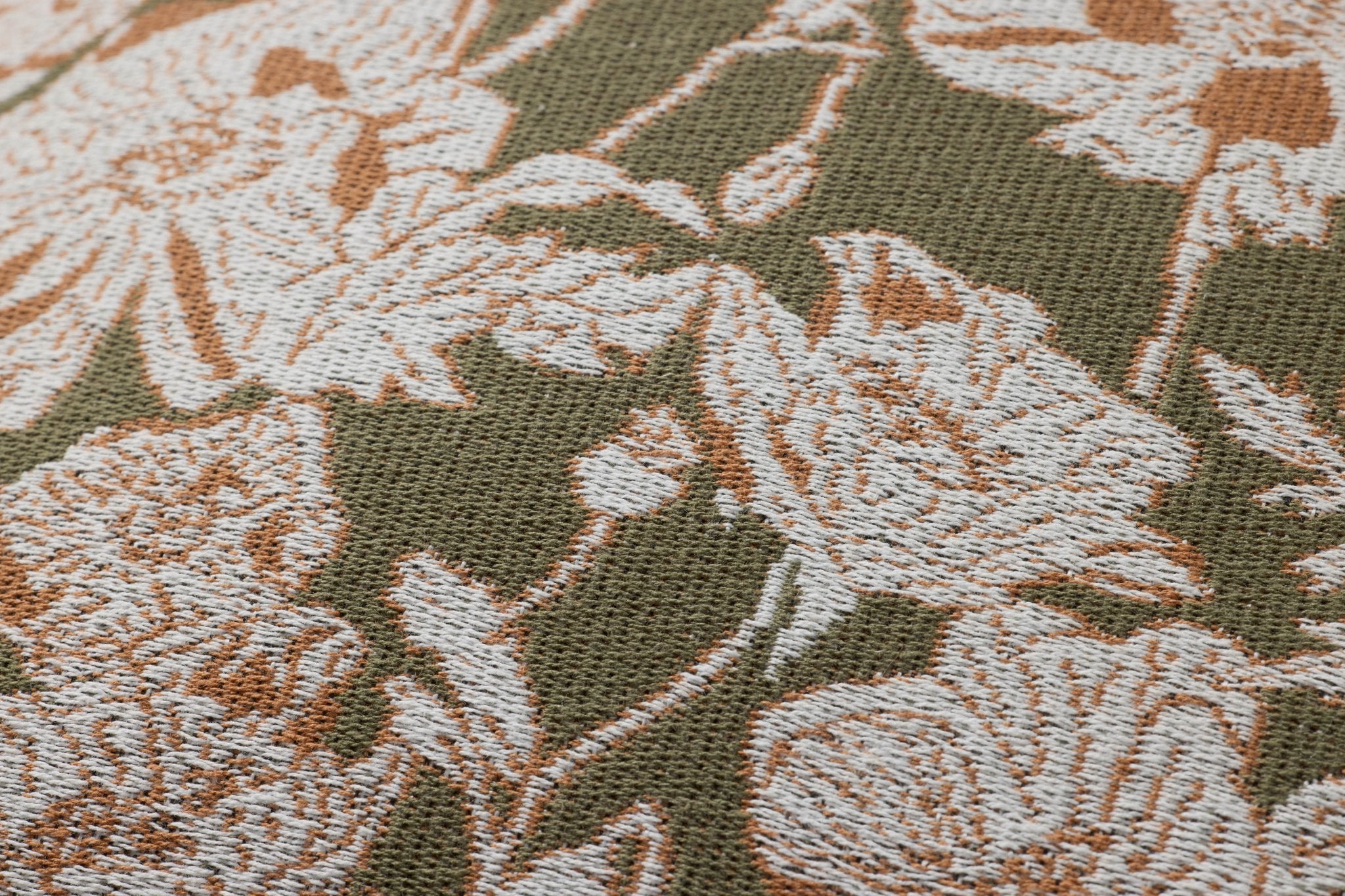Matilda is a jacquard woven throw pillow from Chris Loves Julia x Loloi with ivory and brown hand-drawn florals against an olive green background for a sophisticated multi-tonal look. The pillow cover is made of cotton and polyester and measures 18” x 18”, the perfect size to style in living rooms and bedrooms.