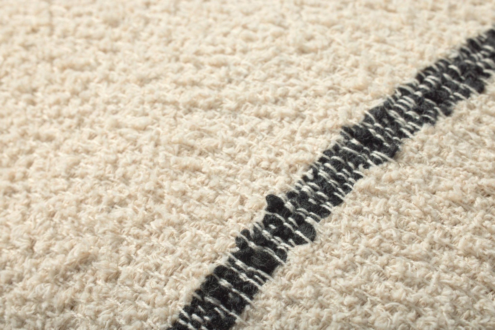 This soft, nubby throw pillow from Brigette Romanek x Loloi features a single black stripe against a natural ivory background. The front pillow cover is made of cotton and other fibers and measures 18” x 18”, a standard size to style in living rooms and bedrooms.