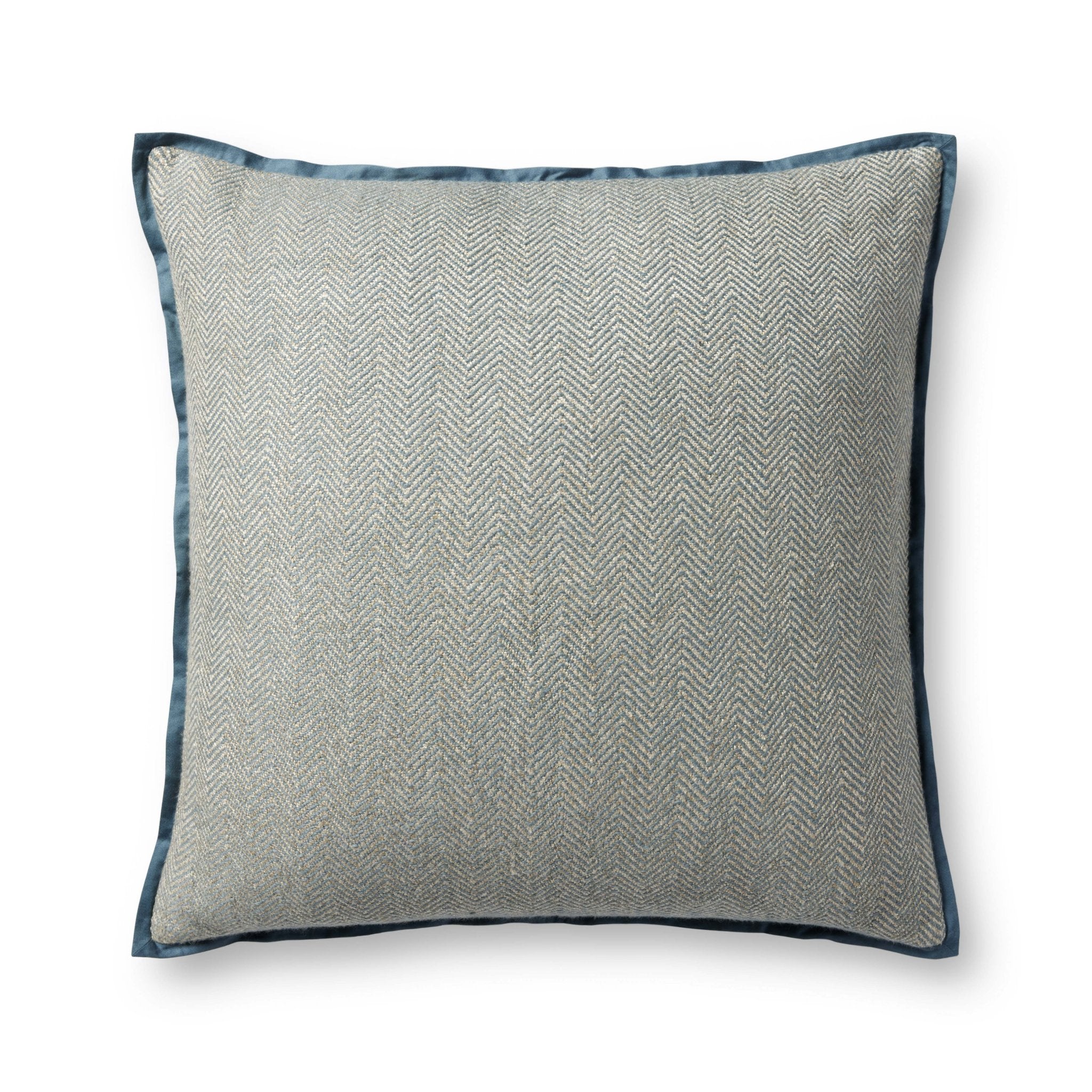 This soft blue throw pillow from Jean Stoffer x Loloi features a darker blue piping for a polished look. The pillow cover is made of cotton and rayon and measures 22” x 22”, a standard size to style in living rooms and bedrooms.