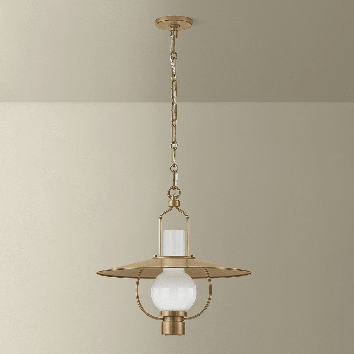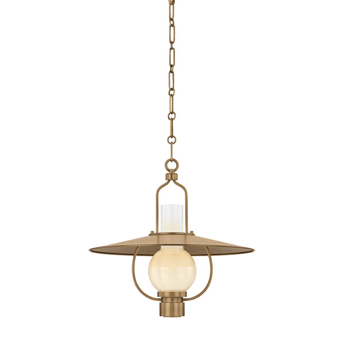 The Cahill pendant captures the clarity of peak mid-century design. A wide metal shade creates a sharp, graphic silhouette, while an opal seedy glass globe softens the form. Finished in Patina Brass, Cahill is both architectural and airy. Available in two sizes, it creates a striking focal point in kitchens, dining areas, and entryways.