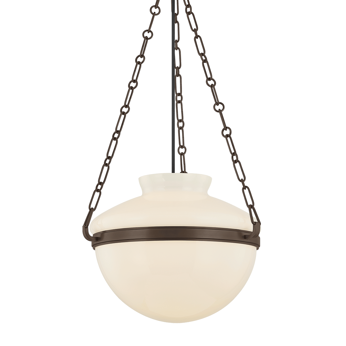 With a silhouette that nods to the past, Paradigm reimagines the classic lantern with bold, generous proportions and a contemporary sensibility. A large student-style opal shiny glass shade hangs from a trio of chunky chains, finished in either polished Patina Brass or an understated Bronze finish. Available in two sizes, Paradigm blends heritage and modernity into a sculptural overhead statement.