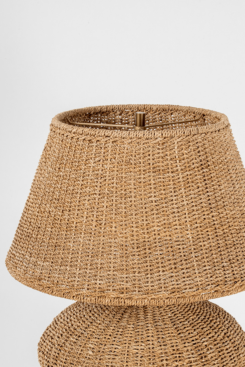 Celebrating the beauty of imperfection, the sculptural Nette lamp features an asymmetrical body and tapered shade in all-over natural woven Abaca. The shapely silhouette gives Nette a rustic presence, while the Patina Brass finish adds to the warm aura surrounding the piece. Place Nette on a console, desk, or end table for an instant dose of artistry. Part of our Loft and Thought collection.