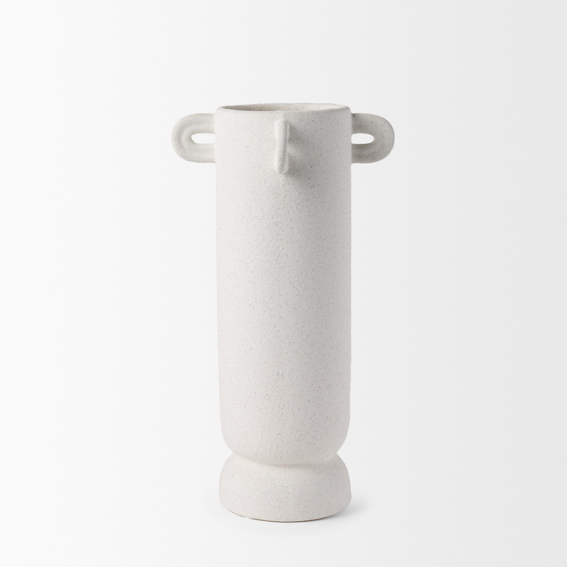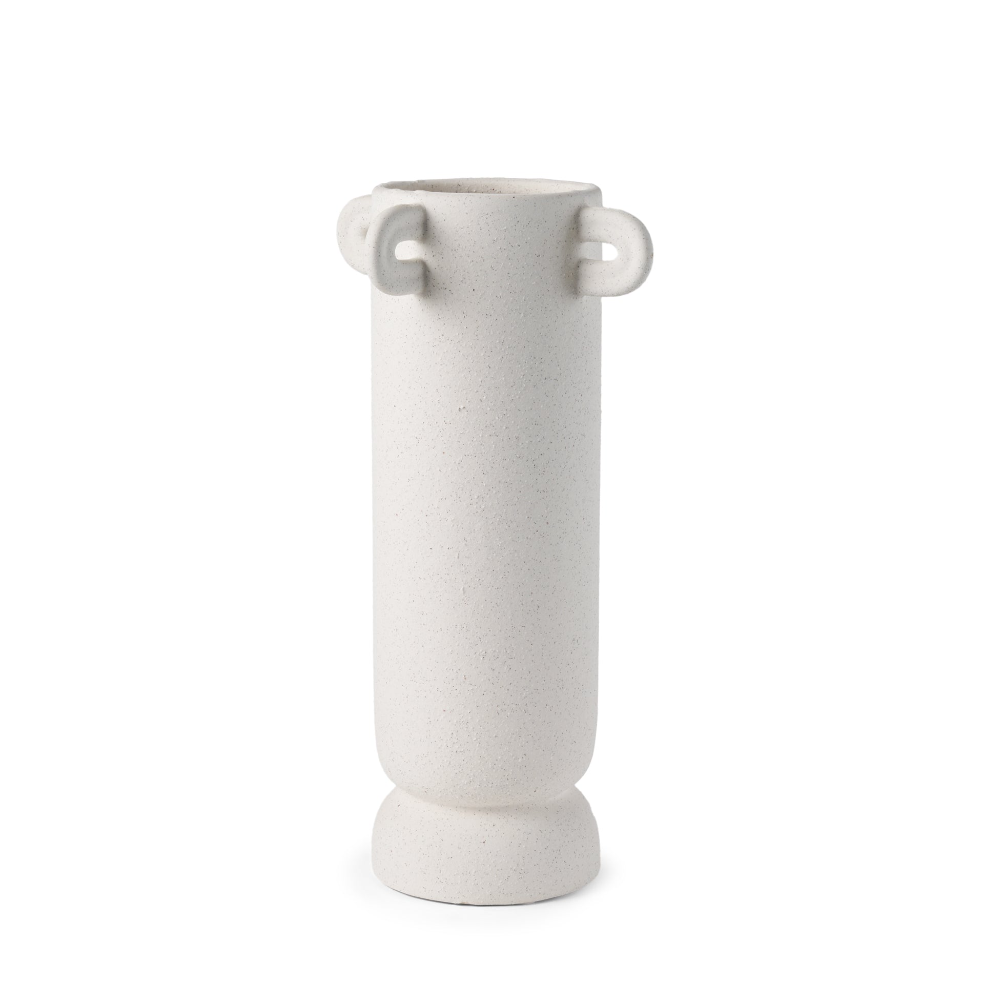 Miles Stone Vase with Handles – The Miles Vase, crafted from ceramic, features a gritty textured off-white finish. Each vase is adorned with delicate black speckling, enhancing its tactile appeal, and features four decorative handles for a touch of charm. Its smooth glazed interior ensures durability while providing a watertight vessel for displaying floral and arrangements. Ideal for styling alone or with botanicals, this vase is available in two sizes for a coordinated aesthetic.