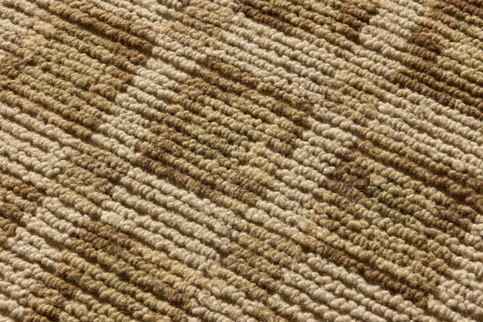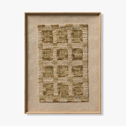 Ready-to-hang Descanso wall art from Amber Lewis x Loloi features a hand-tufted wool textile with a broken stripe pattern in an earth-toned palette, measuring 42” x 32”. The artwork is made in India and custom-framed in Dallas, Texas.