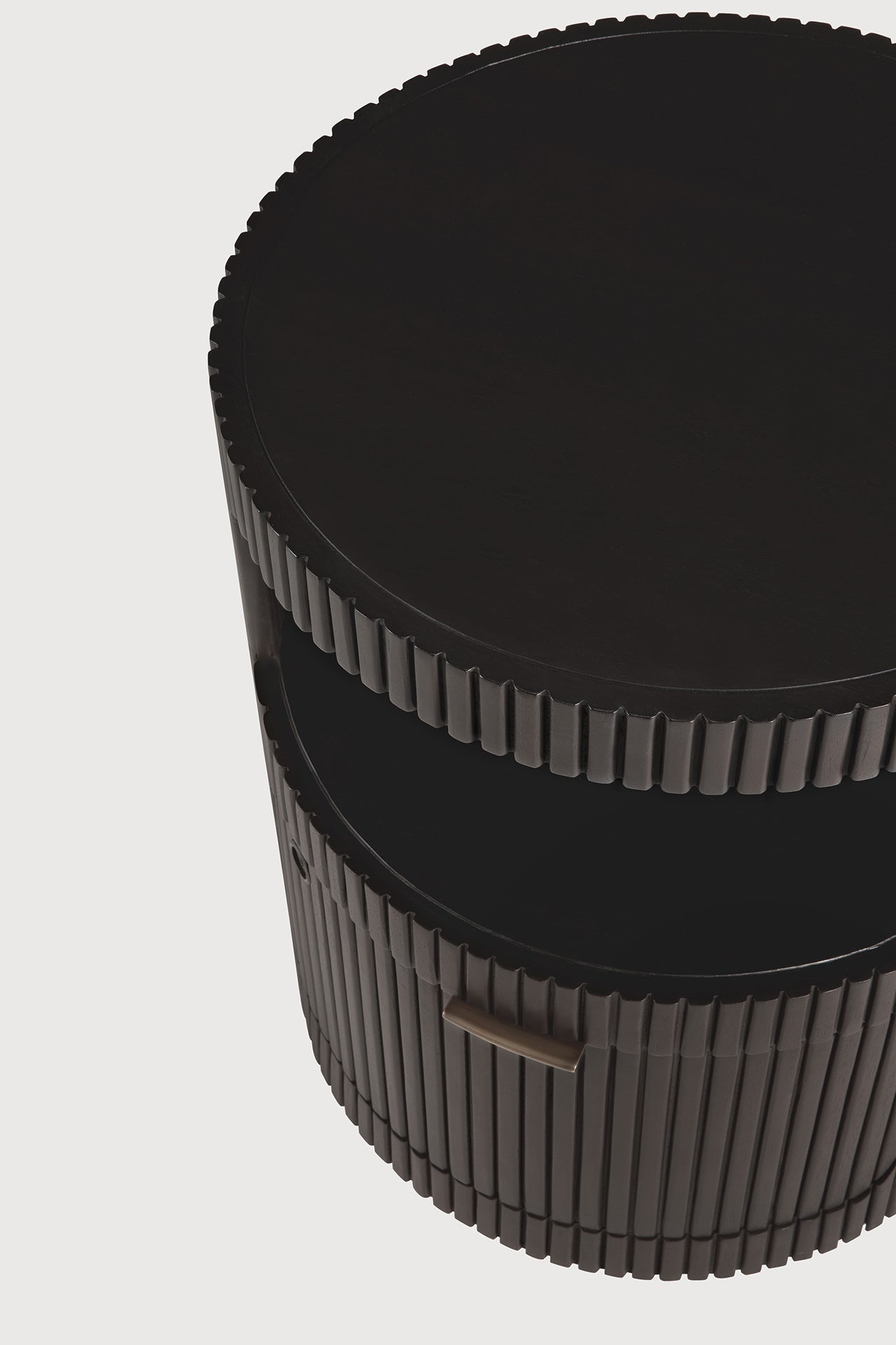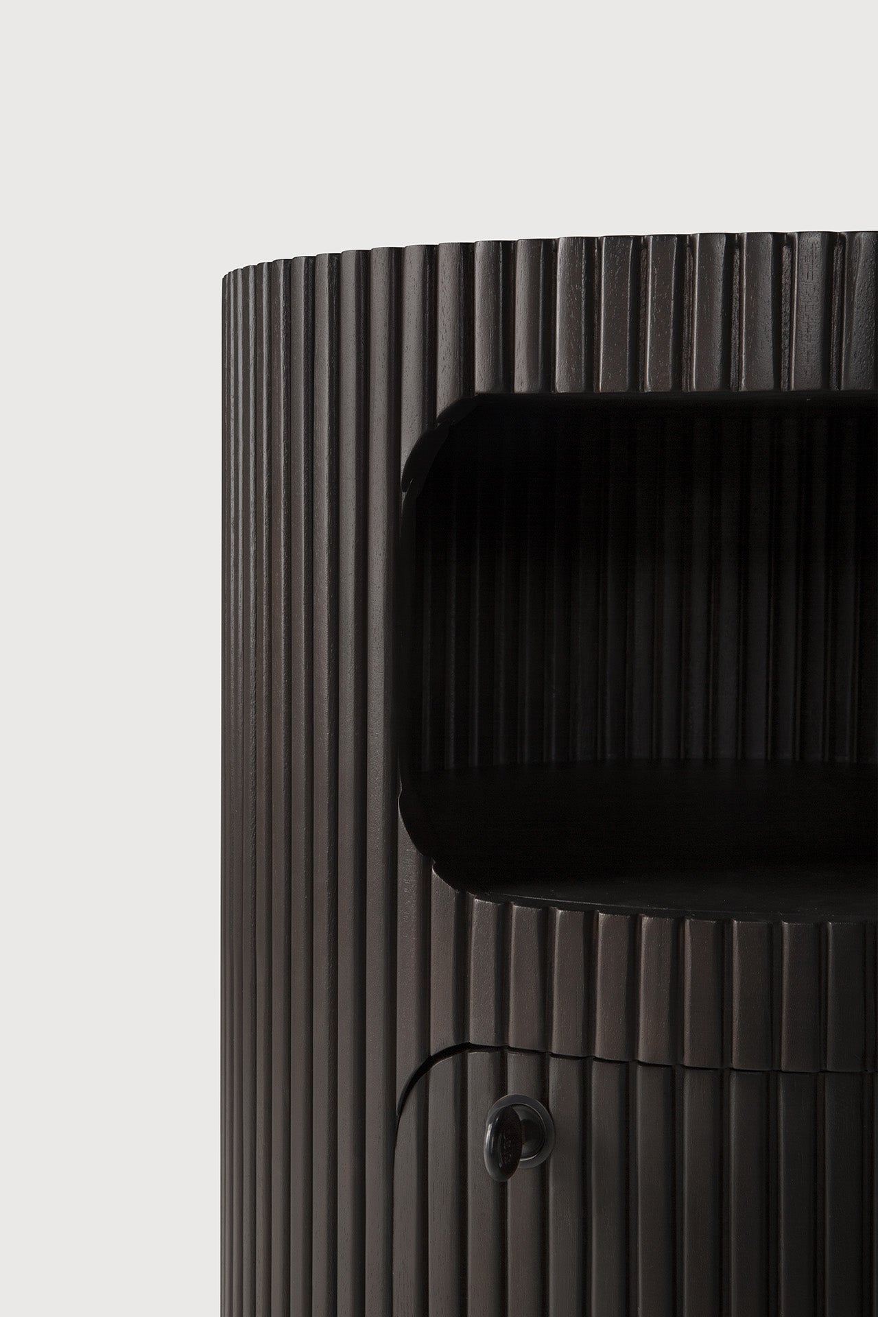 The single drawer features a subtle keylock mechanism, discreetly embedded to provide secure storage without interrupting the unit’s sleek silhouette. The handle-free drawer front maintains a minimalist aesthetic, its gentle curve echoing the organic inspiration behind the piece. The varnish not only enhances the wood’s inherent beauty but also lends a resilient coating, protecting against daily wear while preserving the smooth finish.