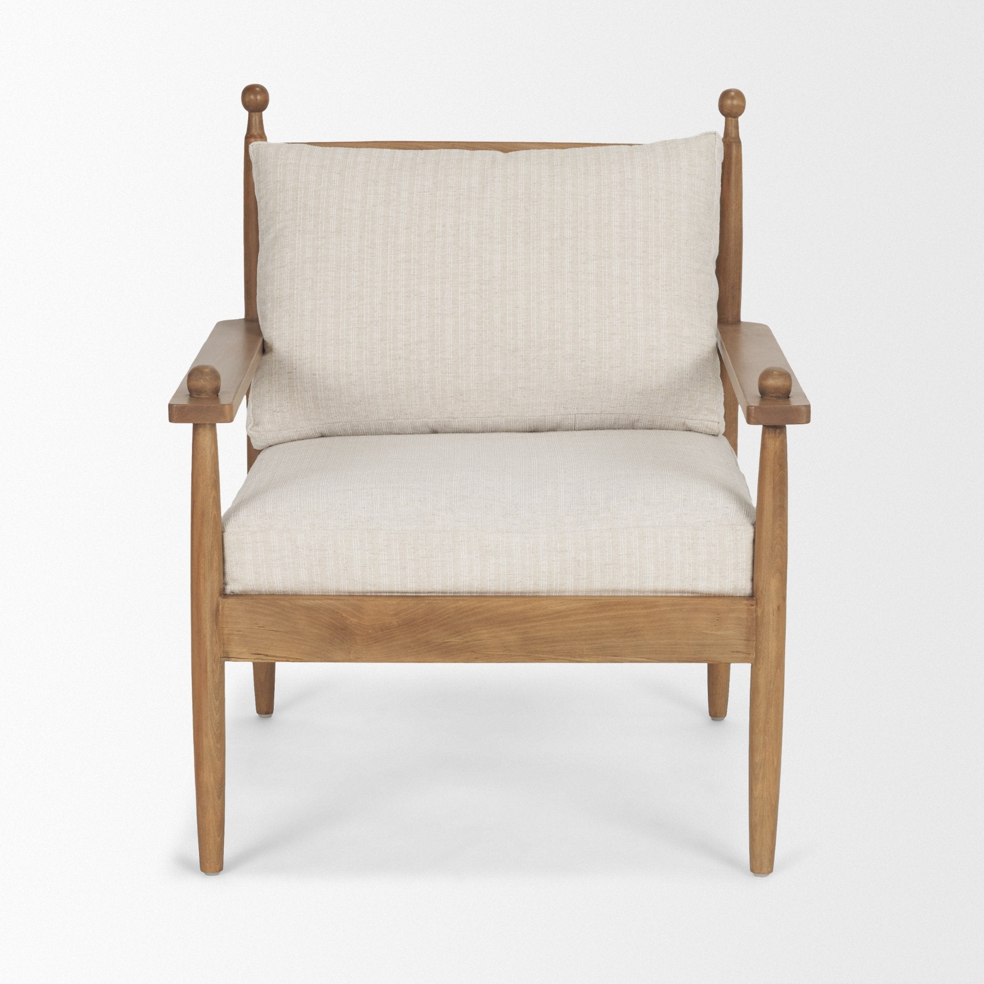 Elevate your space with the Emry Beige Fabric Beach Wood Framed Accent Lounge Chair—a sophisticated blend of modern craftsmanship and relaxed elegance. This versatile accent chair features a warm, light brown beechwood frame with classic tapered spindle legs and charming sphere accents for a touch of architectural interest. The soft cream and beige upholstered cushions offer plush comfort while highlighting the textural contrast between fabric and wood. Inspired by traditional Windsor chairs with a slatted back design, the Emry chair adds timeless appeal to any interior.
