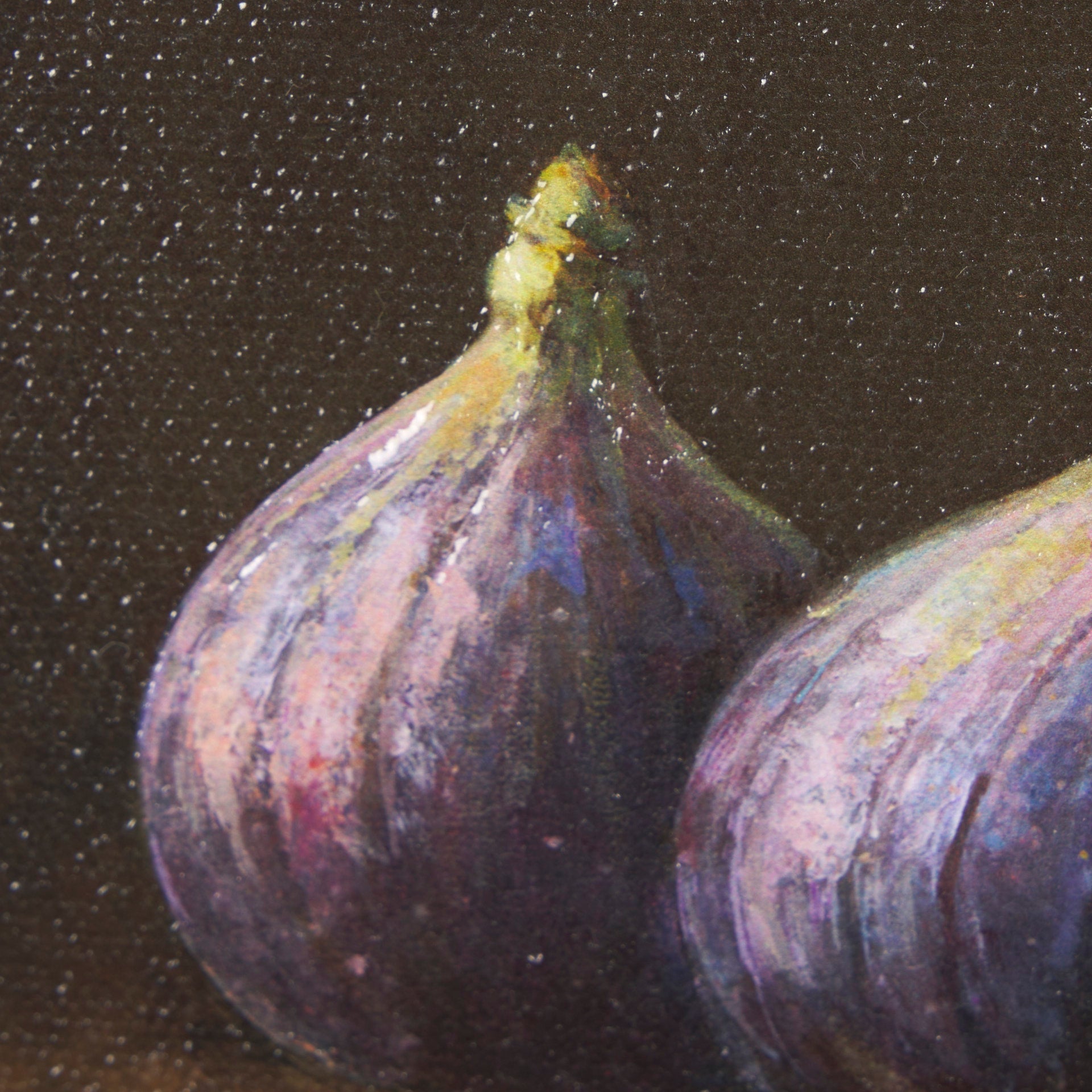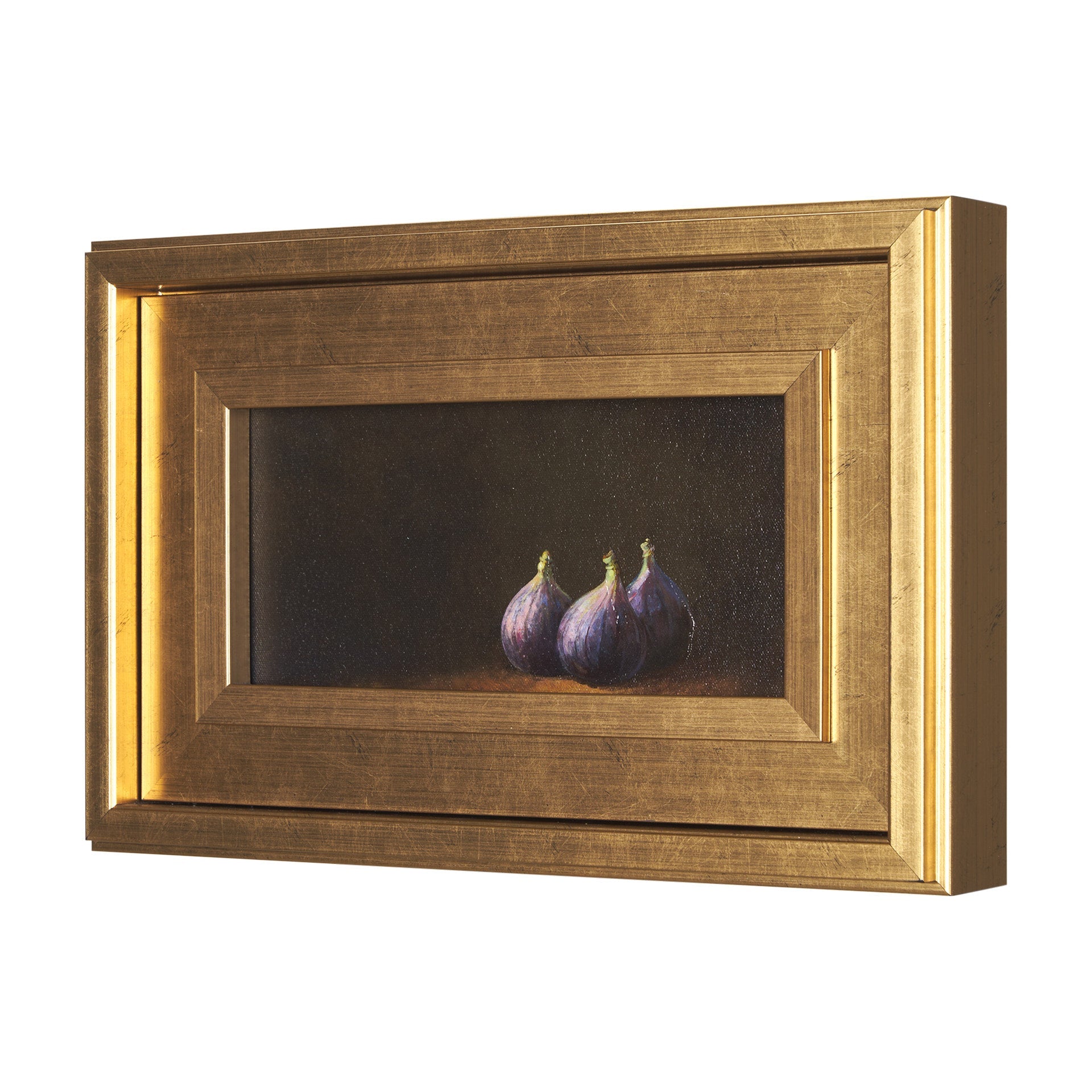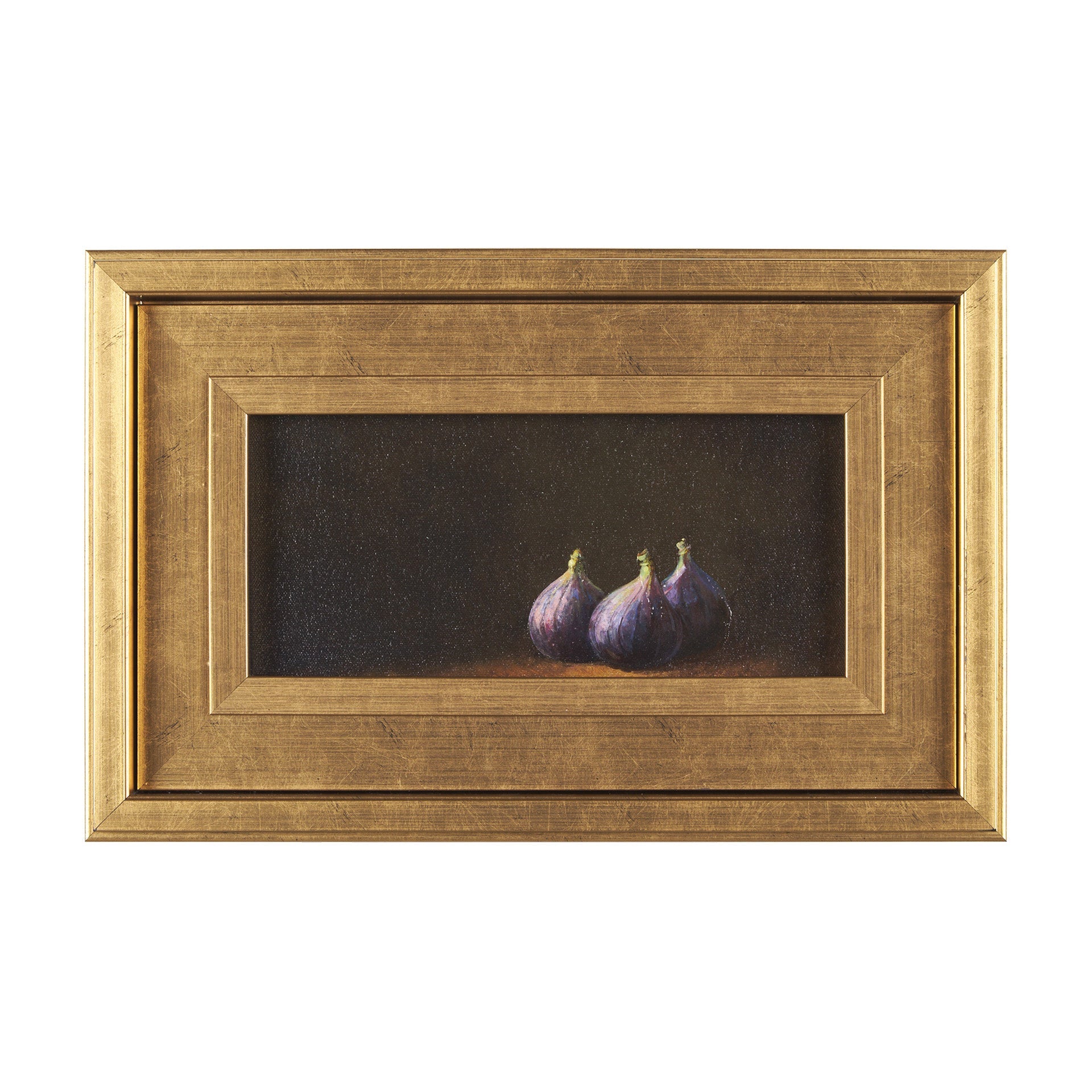 "Lonely Figs" is a captivating still life that brings the richness of nature indoors. Featuring lush figs bathed in soft, elegant lighting, this piece is rendered in oils with exquisite detail. The deep, moody palette contrasts beautifully with the vibrant purples, while the hand embellishment and refined frame add a tactile depth that elevates its timeless appeal.