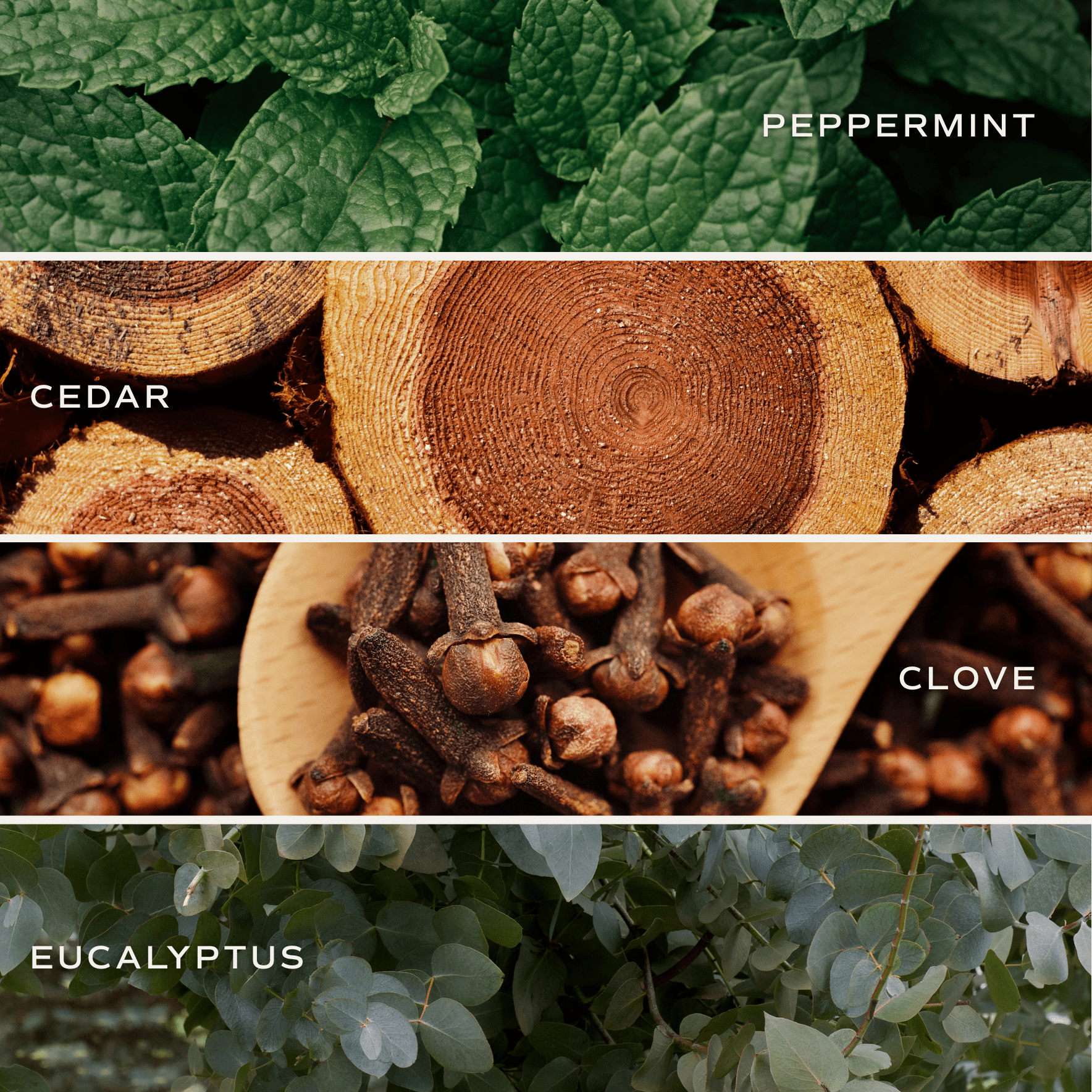 Infused with natural essential oils: eucalyptus oil, cornmint oil, cedarwood oil, patchouli oil