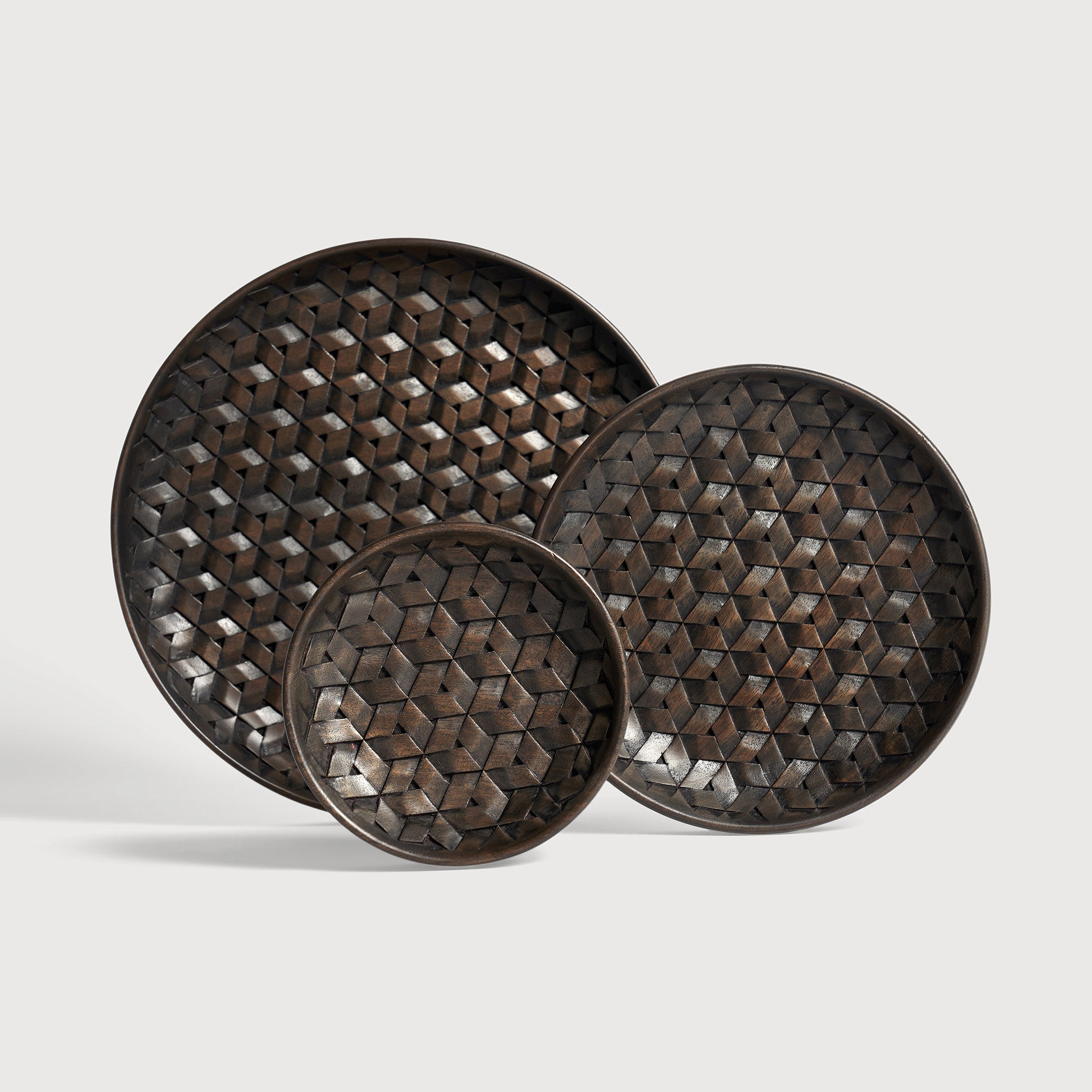 Bathed in the deep, sensuous warmth of varnished mahogany, the Tampa boards by Ethnicraft are an ode to craftsmanship and natural beauty. Each board in this set of three carries a rich, dark brown patina that promises to age gracefully, developing character with every use. The subtle sheen of the varnish enhances the wood’s intricate grain patterns, lending a tactile allure that invites both touch and admiration.