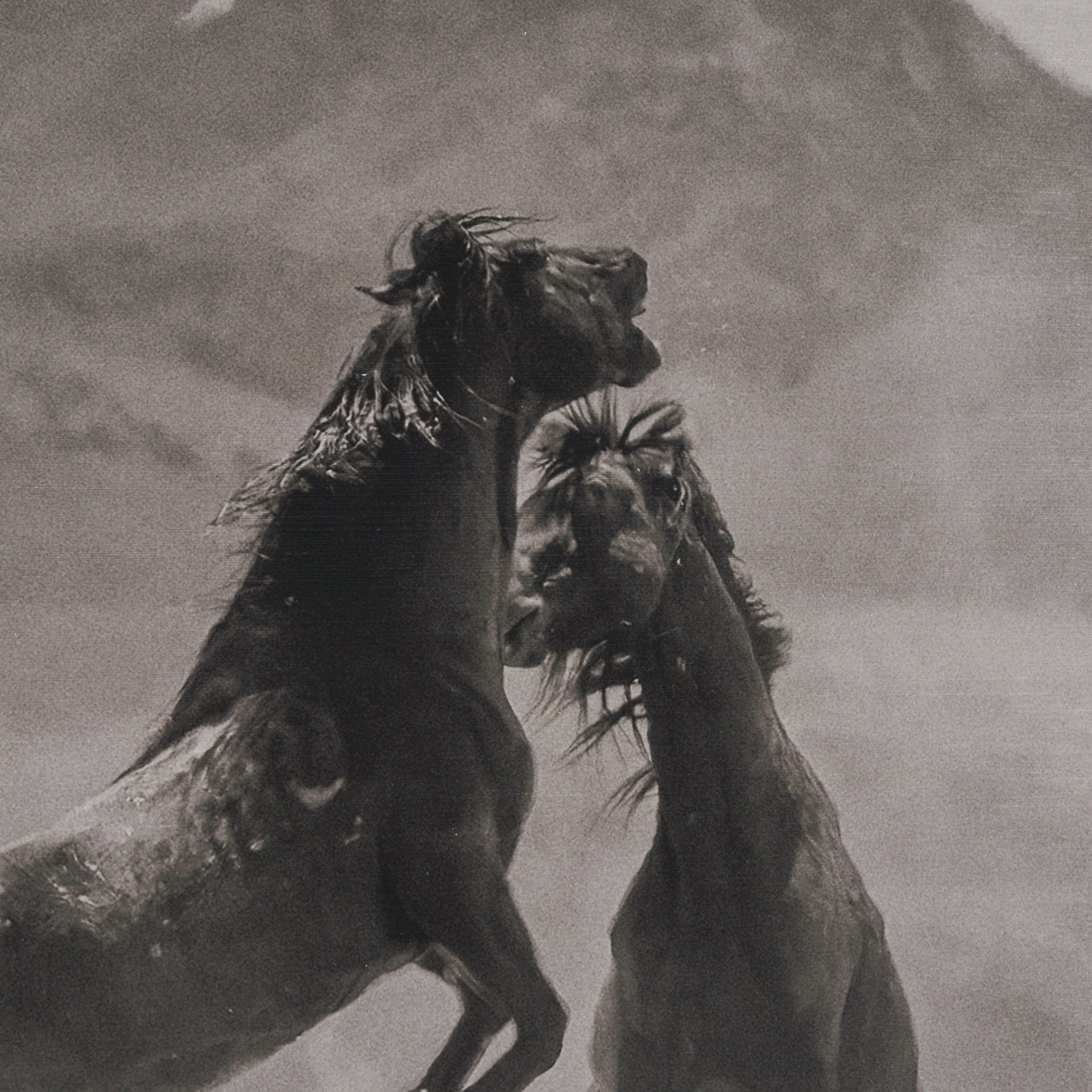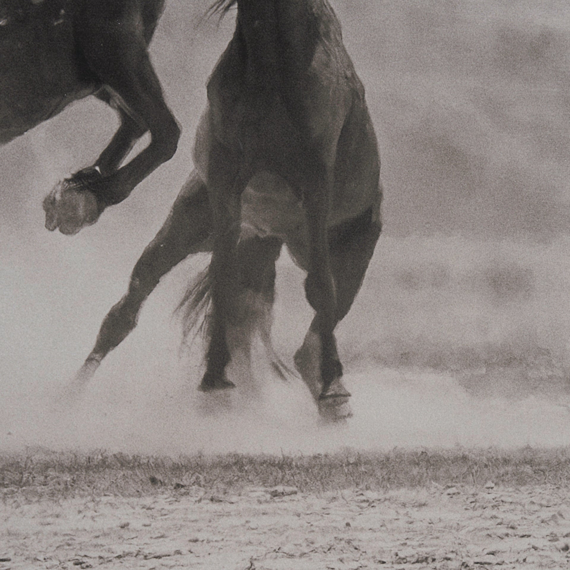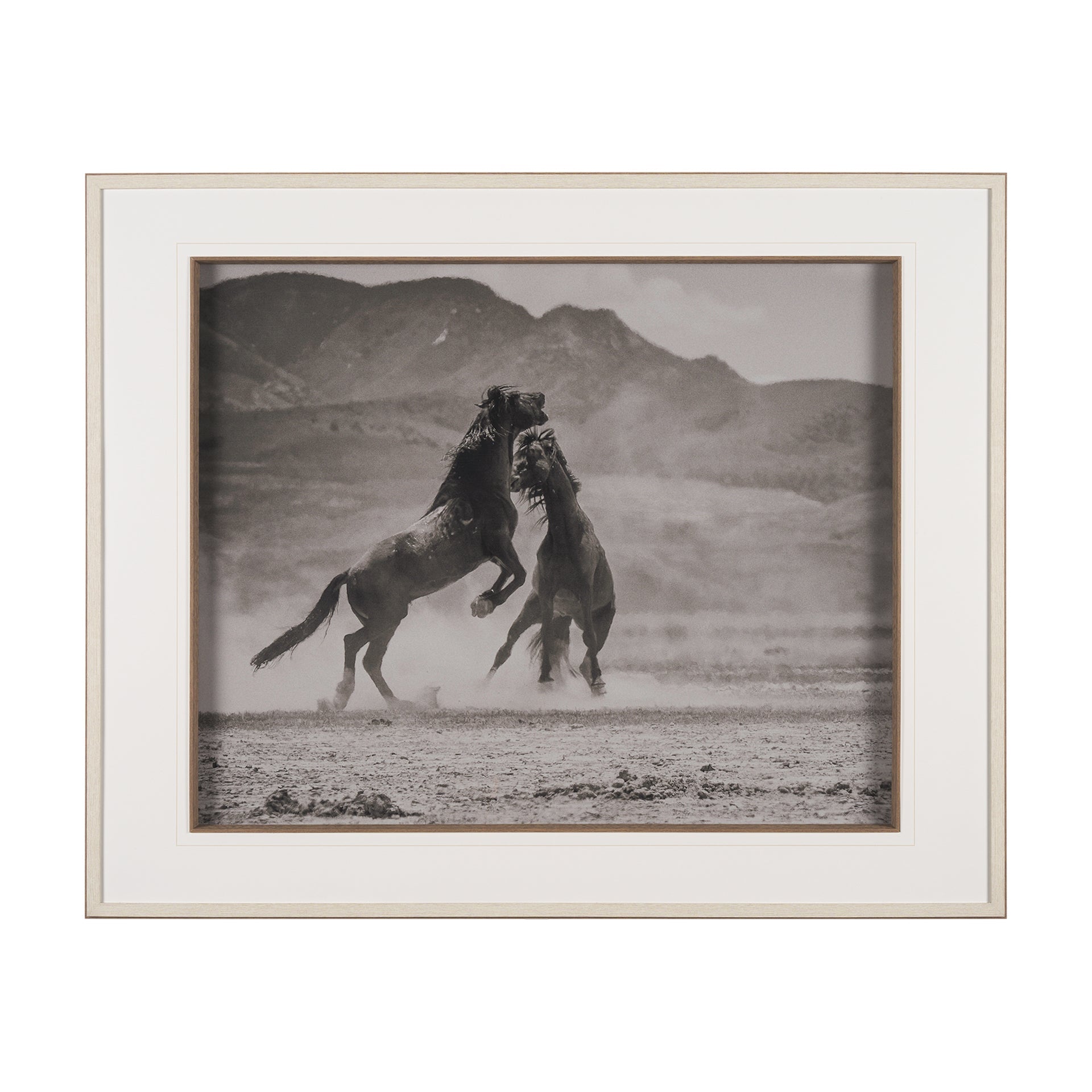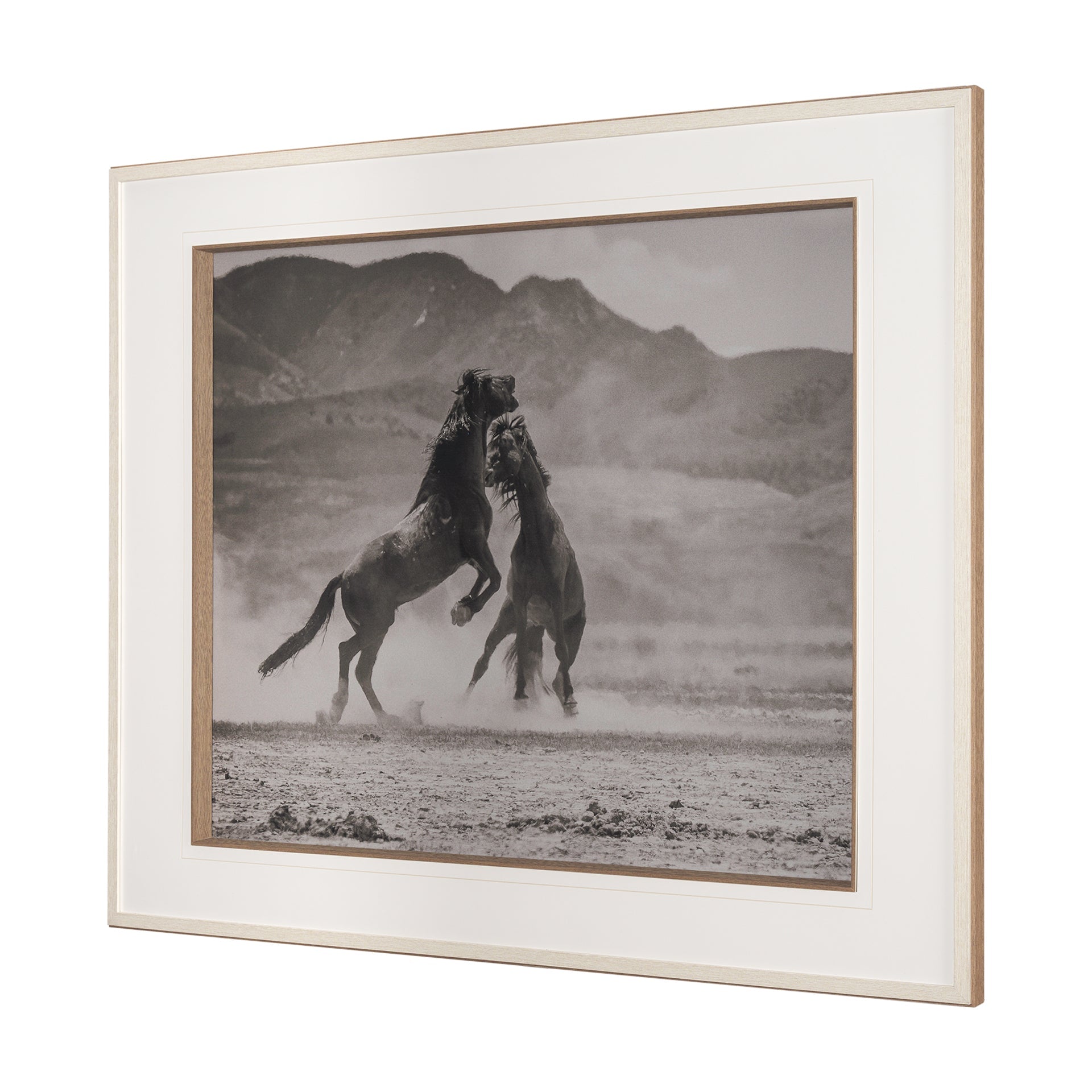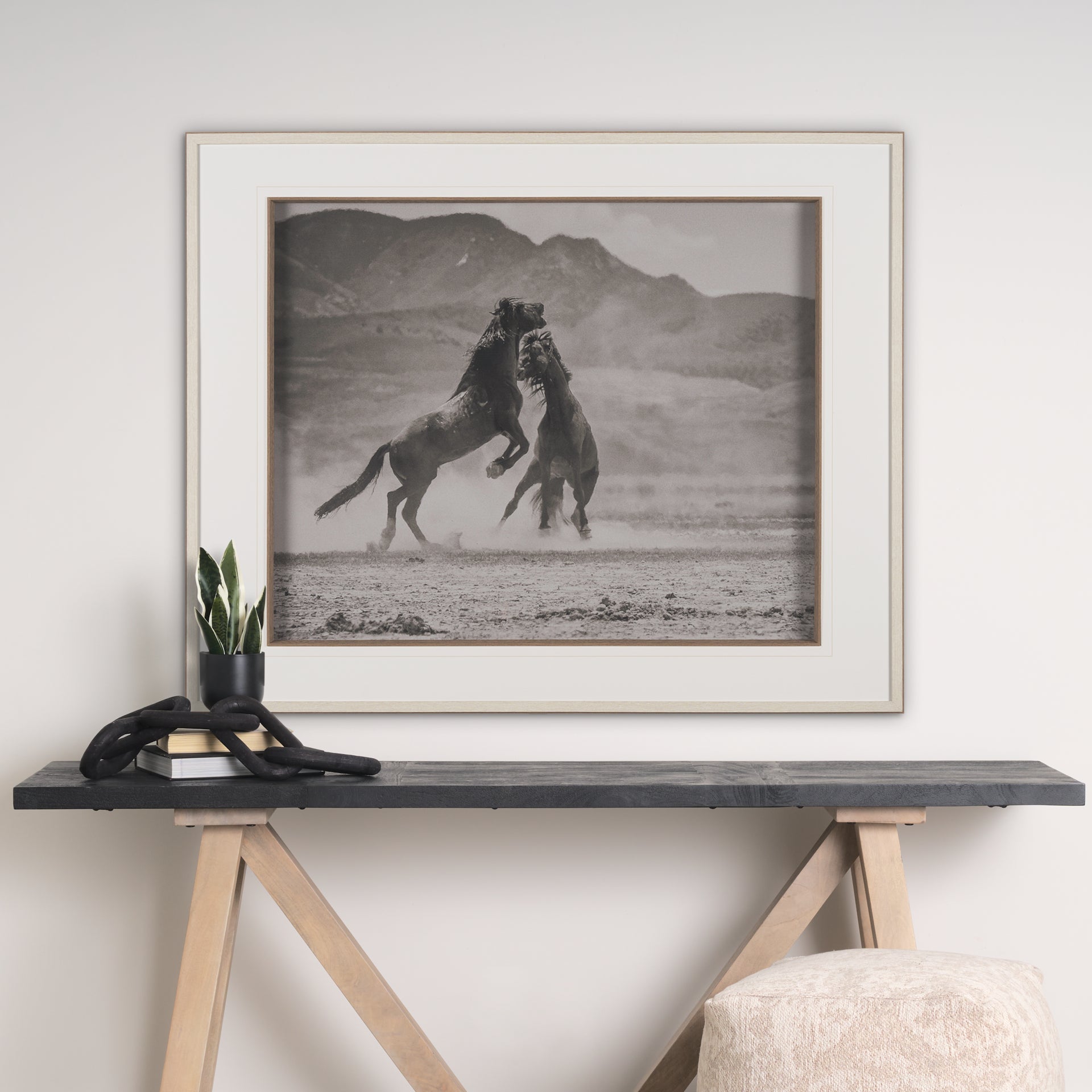 "The Meeting" by Nancy Crowell is a striking hand-embellished framed photographic art print capturing the raw power and grace of two wild horses in mid-struggle against a backdrop of majestic mountains. The monochromatic palette enhances the dramatic interplay of light and shadow, while intricate textures bring the arid terrain to life. Inspired by the untamed spirit of nature, this piece evokes a sense of freedom and timeless elegance.