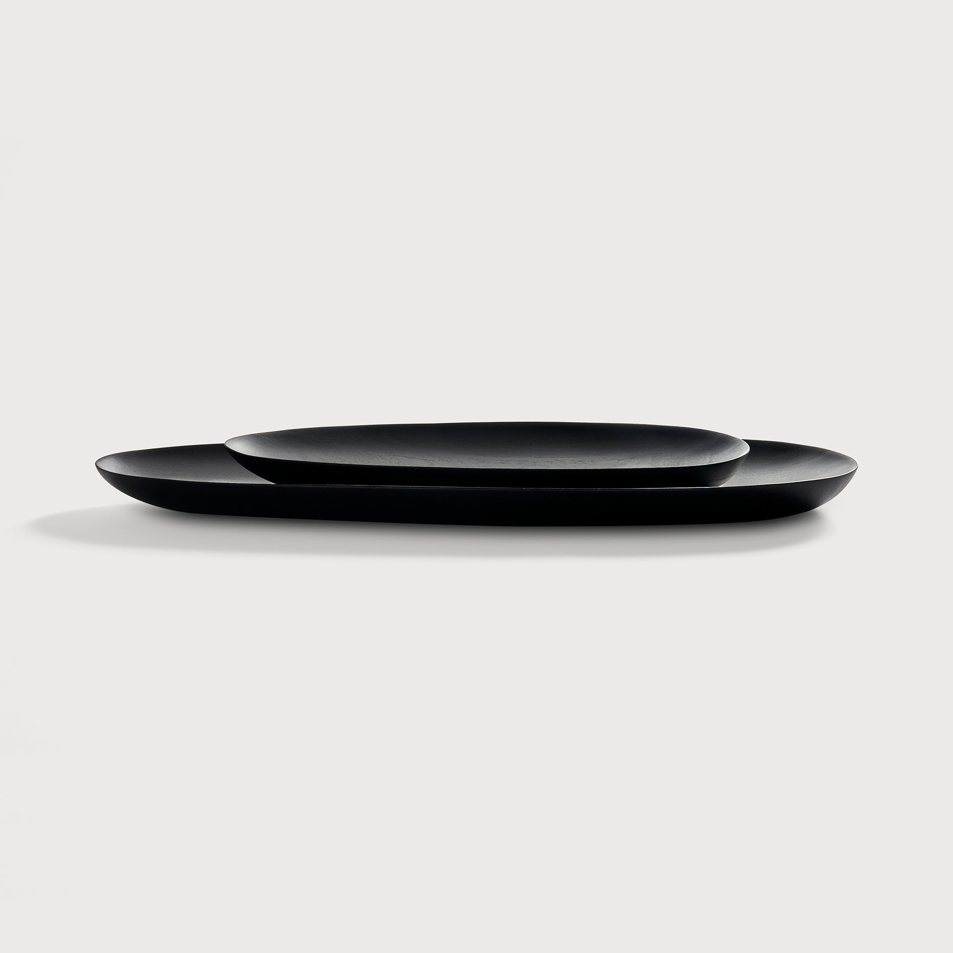 Crafted from finely selected mahogany, these Thin Oval Boards by Ethnicraft exude a quiet elegance through their sleek silhouette and expertly applied black varnish. The natural grain of the wood subtly peeks through the deep, matte finish, offering a sophisticated interplay between organic texture and contemporary design. Their slender form ensures a lightweight yet durable structure, making these boards as functional as they are visually striking.